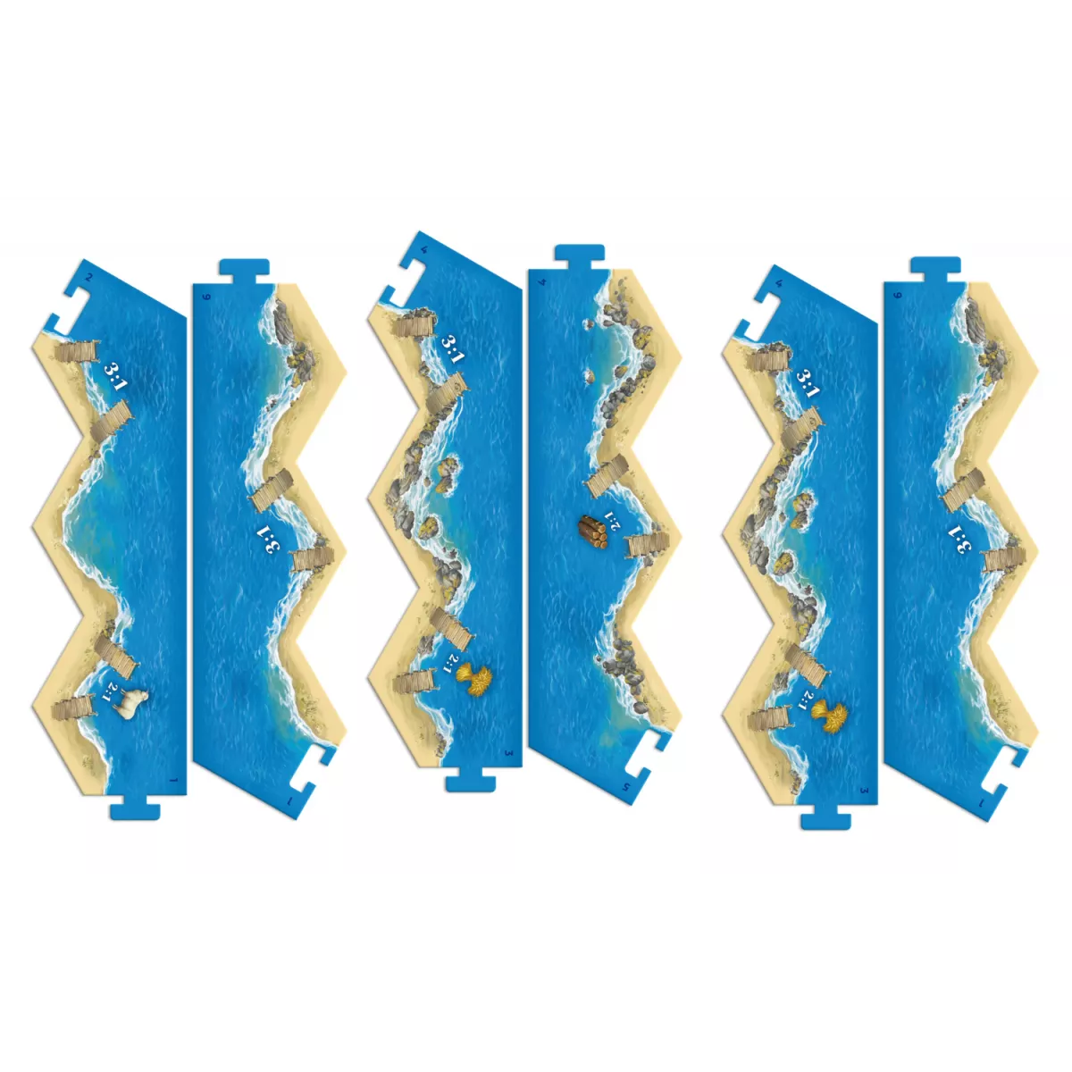 У коробці 6 частин рамки, 19 плиток місцевості різних типів, 18 номерних жетонів, 4 карти-пам'ятки, 2 особливі карти (Найдовший торговий шлях та Найбільше військо), 25 карт розвитку, 95 карт сировини, 16 міст (по 4 кожного кольору), 20 селищ (по 5 кожного кольору), 60 доріг (по 15 кожного кольору), 1 фігурка розбійника, 2 кубики, 2 тримачі для карт, 4 коробки для фігурок