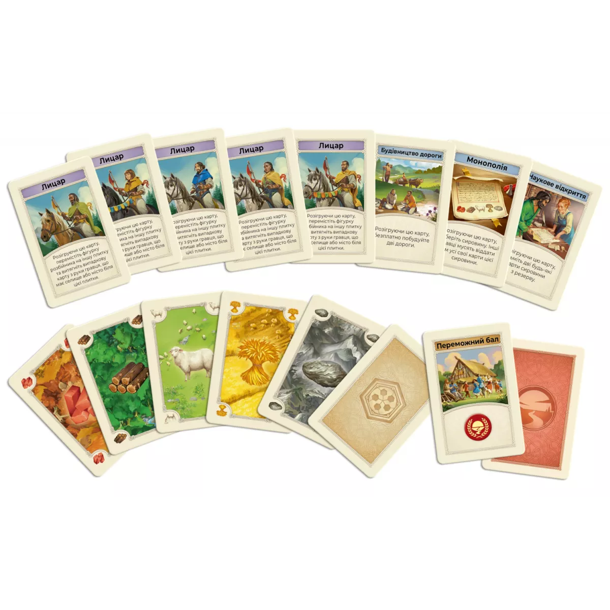 Витративши карти ресурсів, можна отримати карту розвитку — лицаря, переможних очок або прориву. Карта прориву скидається після застосування її ефекту. Зігравши карту лицаря, гравець переміщує розбійника. За найбільше військо (принаймні три карти лицарів) гравець отримує перехідну карту «Найбільше військо» (2 переможних очки).
