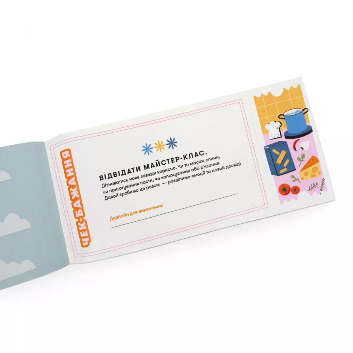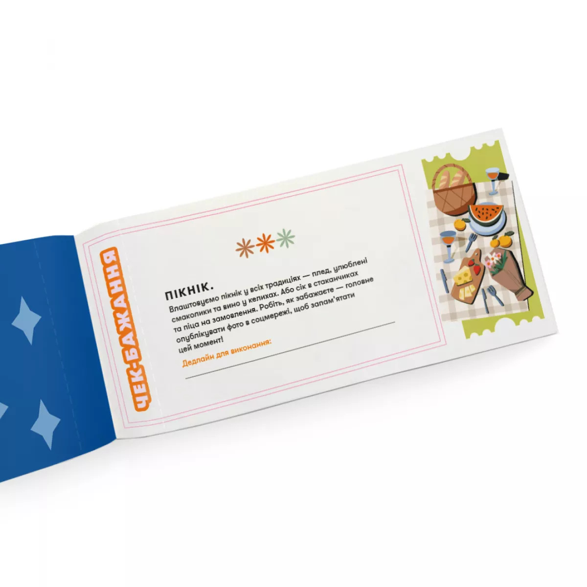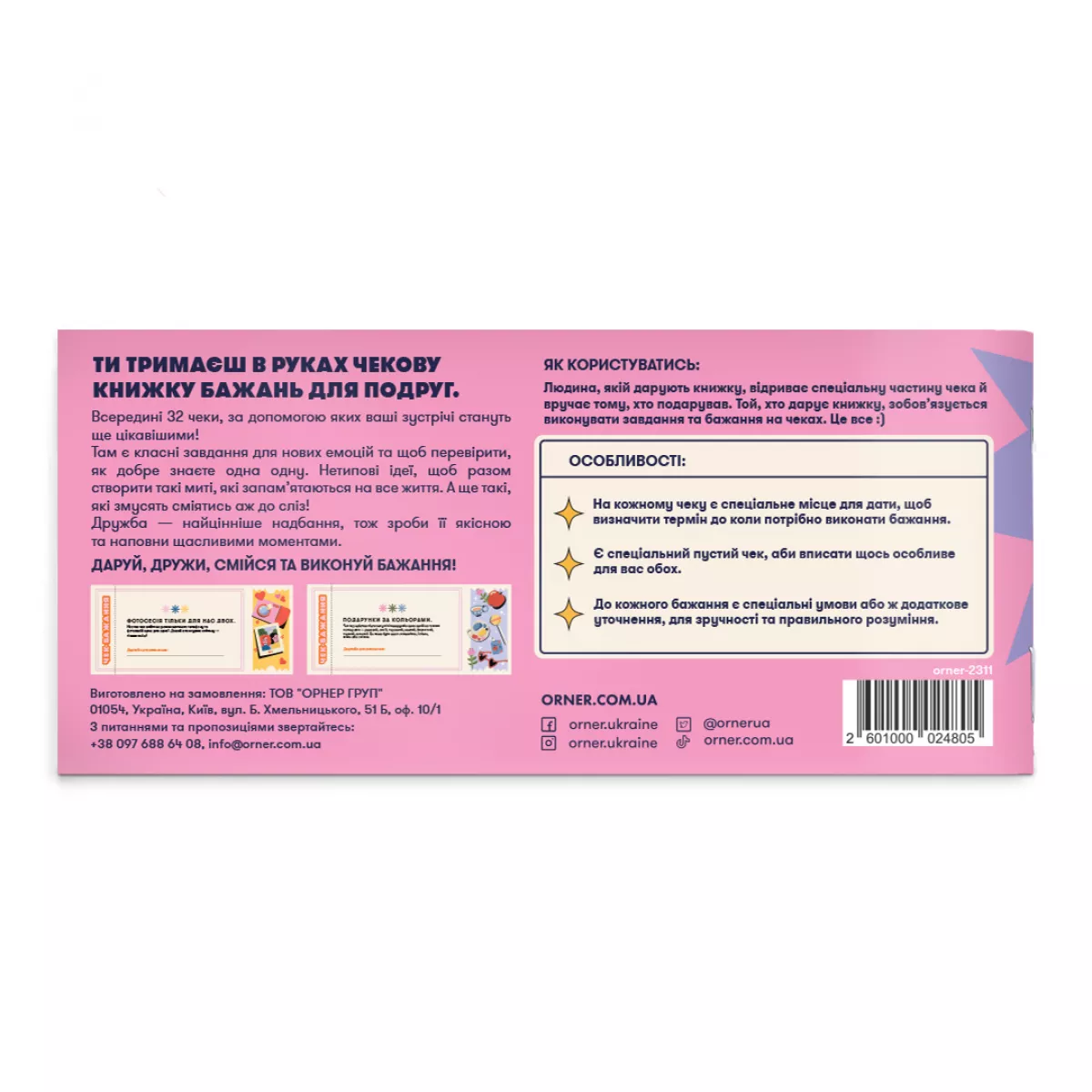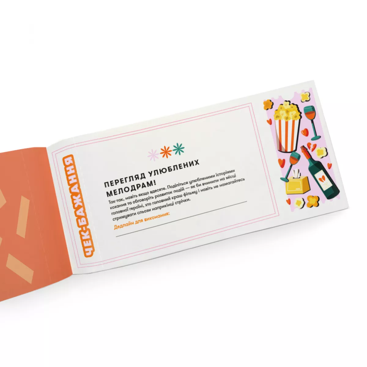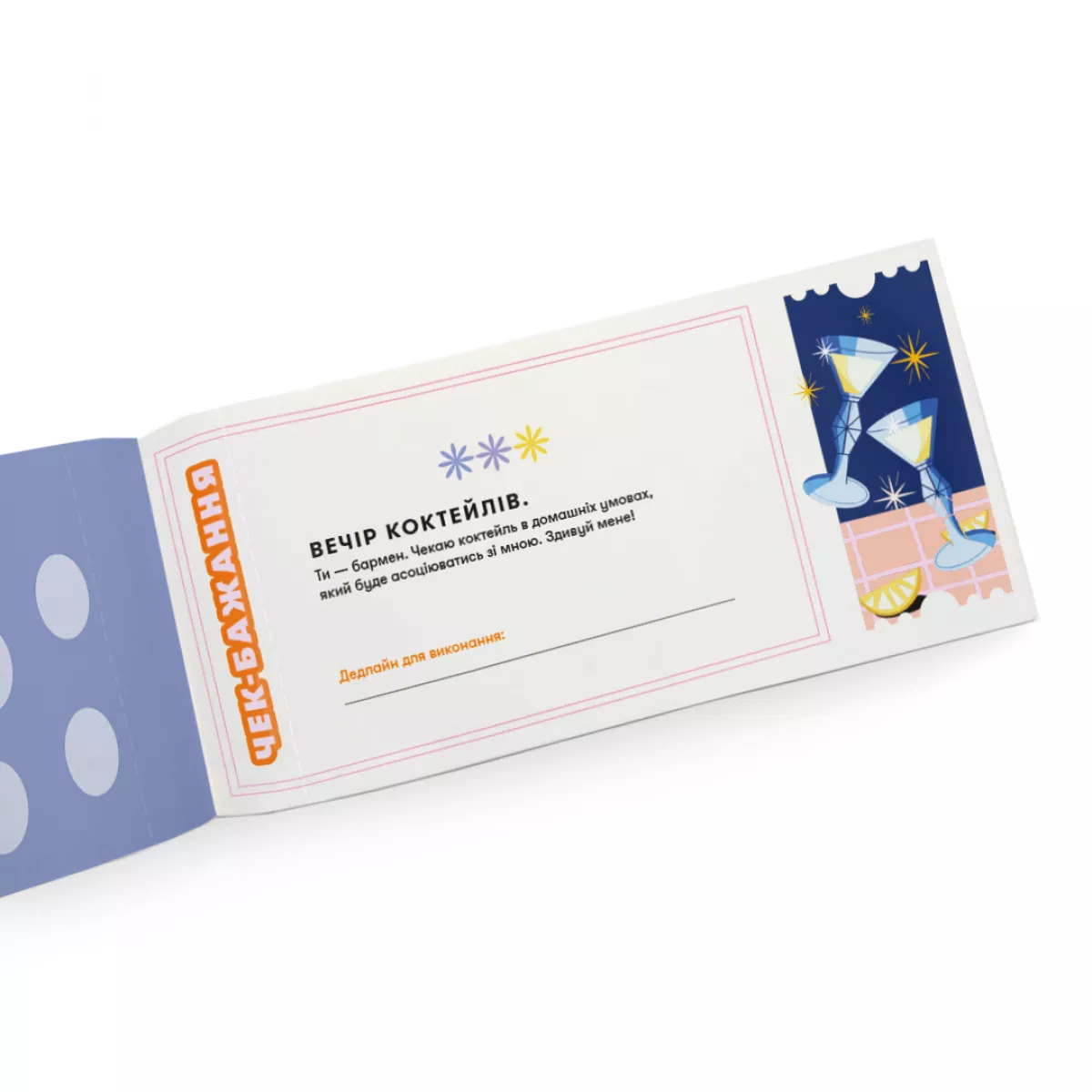 Всередині нетипові ідеї для теплих дружніх посиденьок. Людина, якій дарують цю чекову книжку, відриває чеки один за одним, коли дарувальниця їх виконала. Кожен чек містить завдання, детальне пояснення та місце для позначення дедлайну, тобто дати виконання.