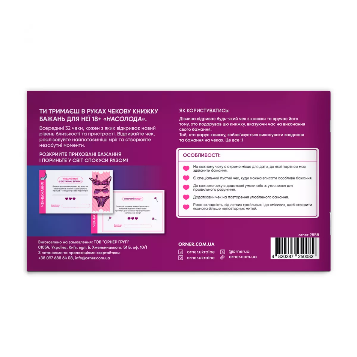 Містить 32 еротичні чеки з приємним лаконічним дизайном. Для більш романтичного настрою рекомендуємо Чекову книжку бажань для пари «Романтика».
