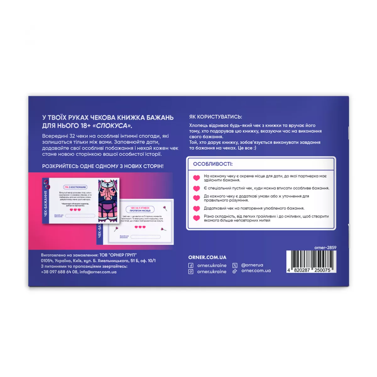 Містить 32 еротичні чеки з приємним лаконічним дизайном. Для більш романтичного настрою рекомендуємо Чекову книжку бажань для пари «Романтика».