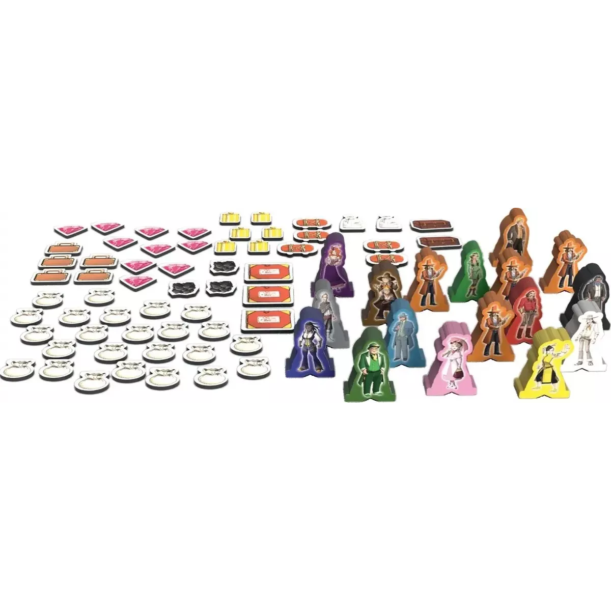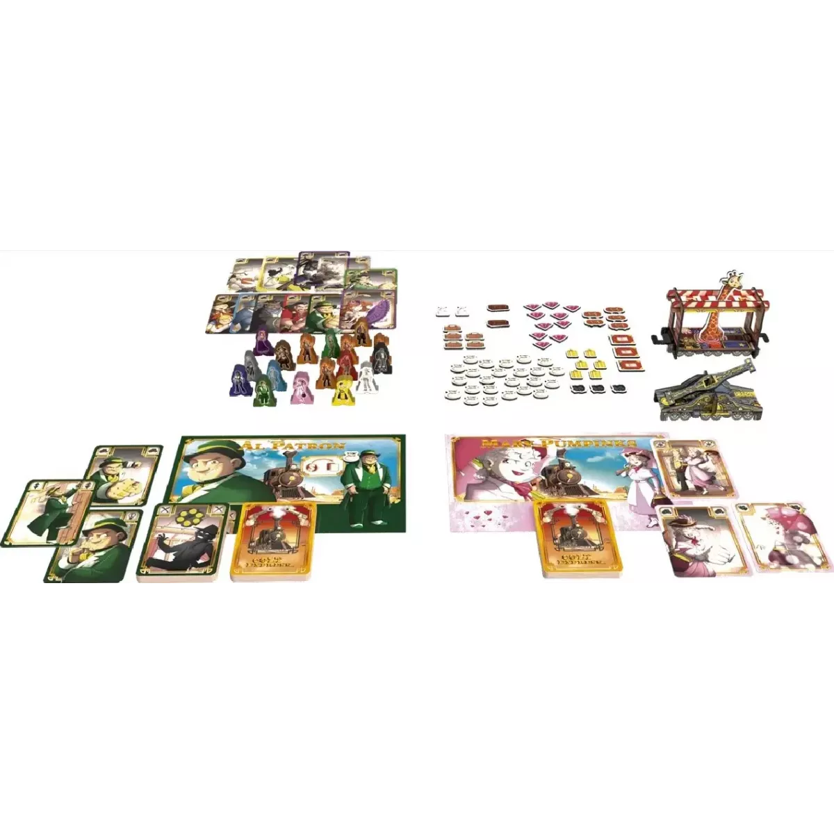 У коробці 11 карт особливих ударів, 17 дерев'яних фігурок персонажів із зображеннями, 60 дерев'яних жетонів здобичі із зображеннями, 1 цирковий вагон, 1 дрезина, Планшет і карти для персонажа Аль Патрон, Планшет і карти для персонажа Мері Пампкінс, Правила