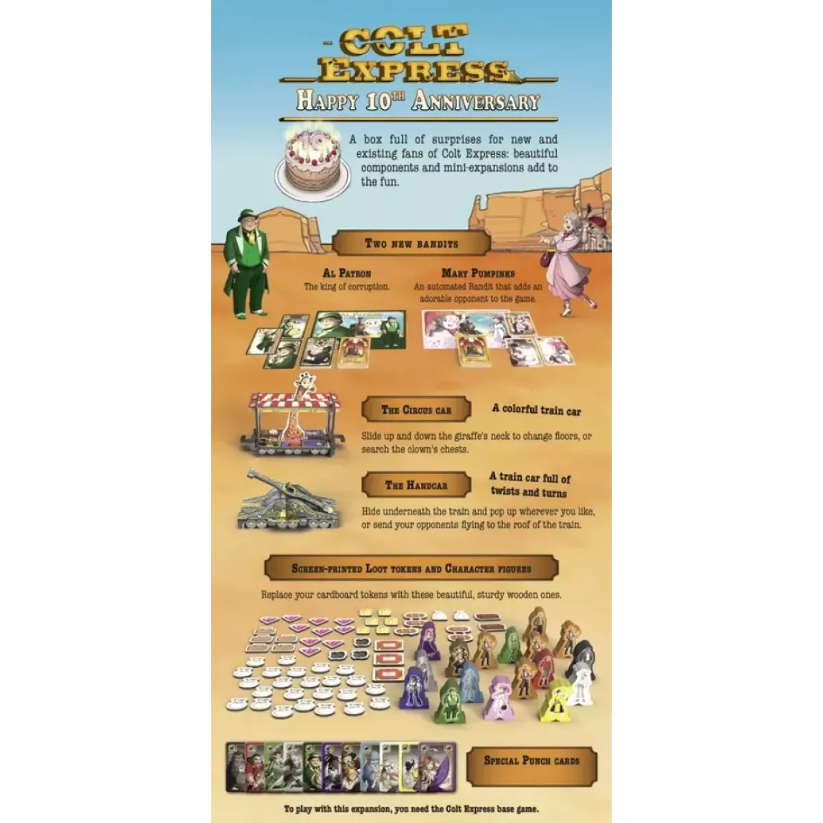 «Кольт Експрес: з 10-ю річницею» – ювілейне доповнення до відомої настільної гри «Кольт Експрес», де гравці в ролі відчайдушних розбійників змагаються між собою. Доповнення додає нових харизматичних персонажів, унікальні механіки та ексклюзивні компоненти, які роблять пограбування ще більш захопливими!