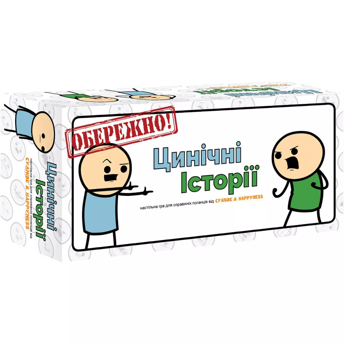 Давайте спершу розставимо всі крапки над Ї: якщо ви ніколи не чули про комікси «Ціанід та щастя» (як таке взагалі сталося?!), то зараз у вас є можливість познайомитись з їх фірмовим гумором. Але зауважте, що це будуть жарти буквально про все, жодних табу та обмежень, максимум цинізму та недоречностей. Тож якщо це вас не лякає – вітаємо, ви полюбите Цинічні історії. Цинічні Історії (Joking Hazard) це карткова настілка для компанії від 3 гравців, у яких ослаблені моральні орієнтири і посилено бажання добряче посміятися над усім на світі. Кожен з нас хоч іноді бажав створити свій комікс Для партії всім гравцям роздаються картки та обирається перший ведучий. Він відкриває карту з колоди, додає до неї ще одну карту з руки та представляє це все іншим гравцям – ми маємо початок (іноді жахливої, іноді мерзенної, іноді просто кумедної) історії. Задачею кожного з гравців є докласти ще одну картку для завершення цього коміксу. І переможне очко заробить той, хто на думку судді поточного раунду створив найсмішнішу історію. Можна звичайно грати на переможні очки, але навіщо, якщо гарний настрій, жарти та веселощі – це вже винагорода для всіх, хто зібрався пограти у Цинічні Історії. Тому на вечірці з друзями коробочка з цією настілкою просто зобов’язана з’явитися на столі! А ще більше Ціанід та Щастя чекатиме вас у ністілці Пекельний Трамвай, яка перевірить не тільки рівень вашого гумору, а ще й моральні принципи, адже доведеться обирати, по яких коліях пустити трамвайчик смерті.