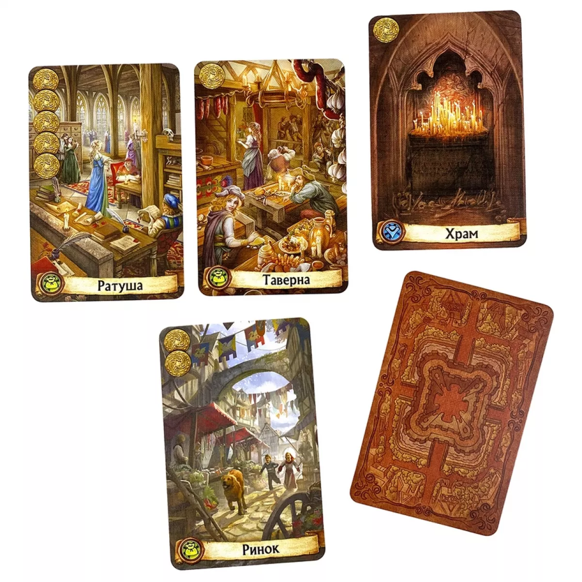 У коробці 27 карт персонажів, 84 карти кварталів, 8 пам'яток, 22 пластикові монети, 27 міні-карт персонажів, 5 карт-маркерів здібностей, пластикова корона, правила гри