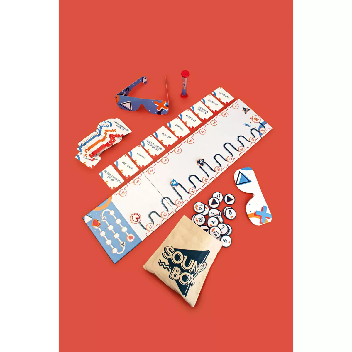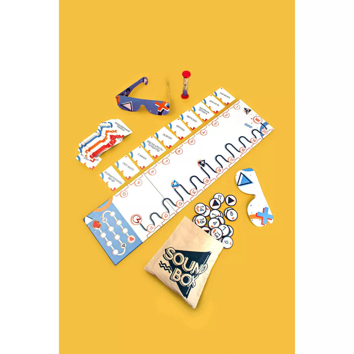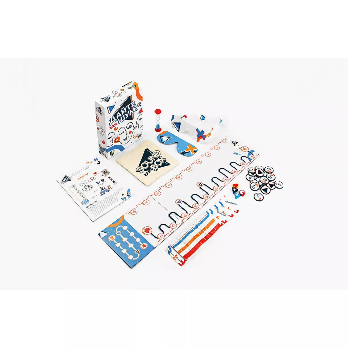 У коробці - Ігрове поле, - 110 карт звуків, - Маркер прогресу, - Маркер серця, - Мішечок звуків, - 20 жетонів номерів (від 1 до 20), - 2 маркери додаткових звуків, - Окуляри слухача, - Окуляри помічника, - Пісочний годинник