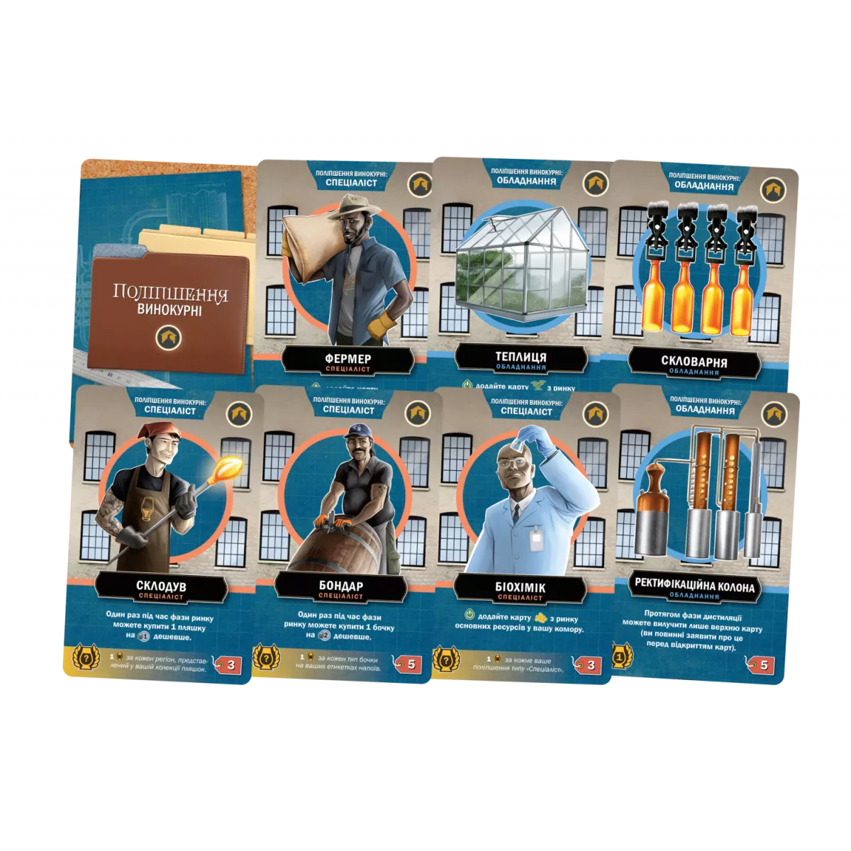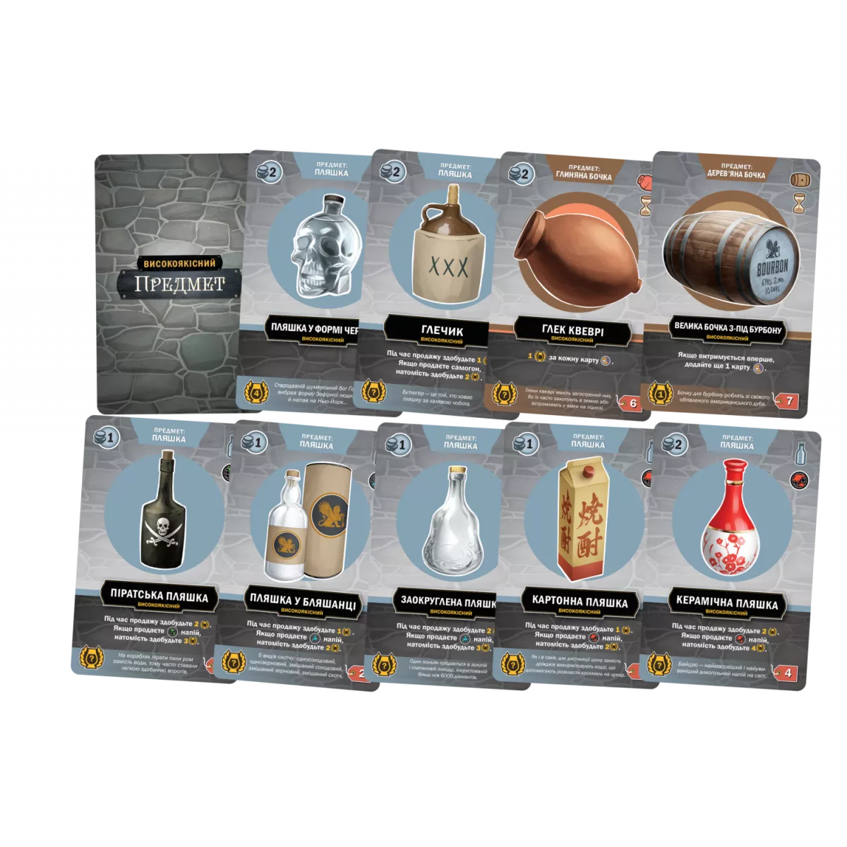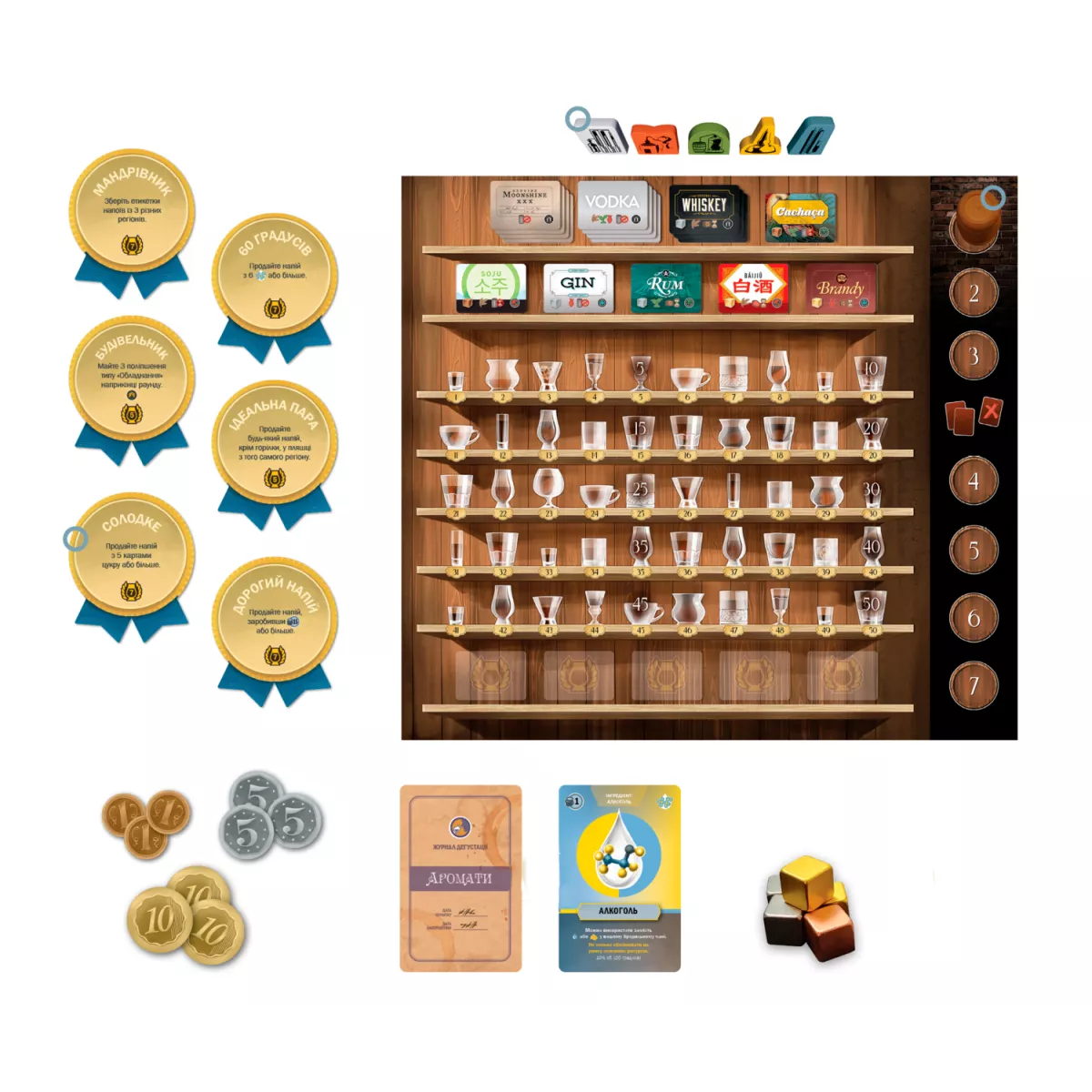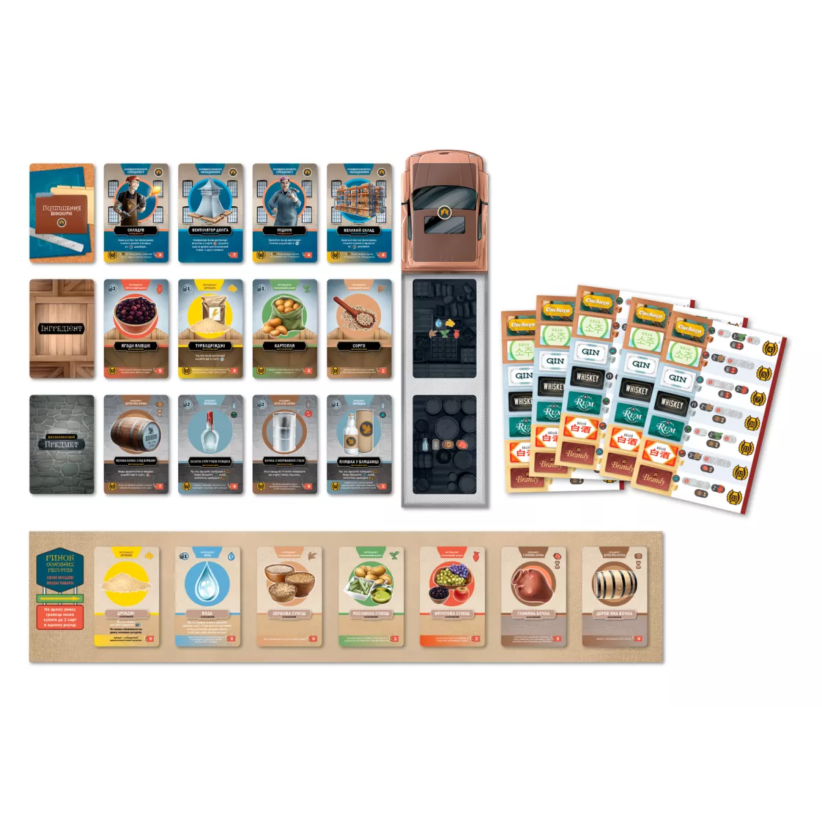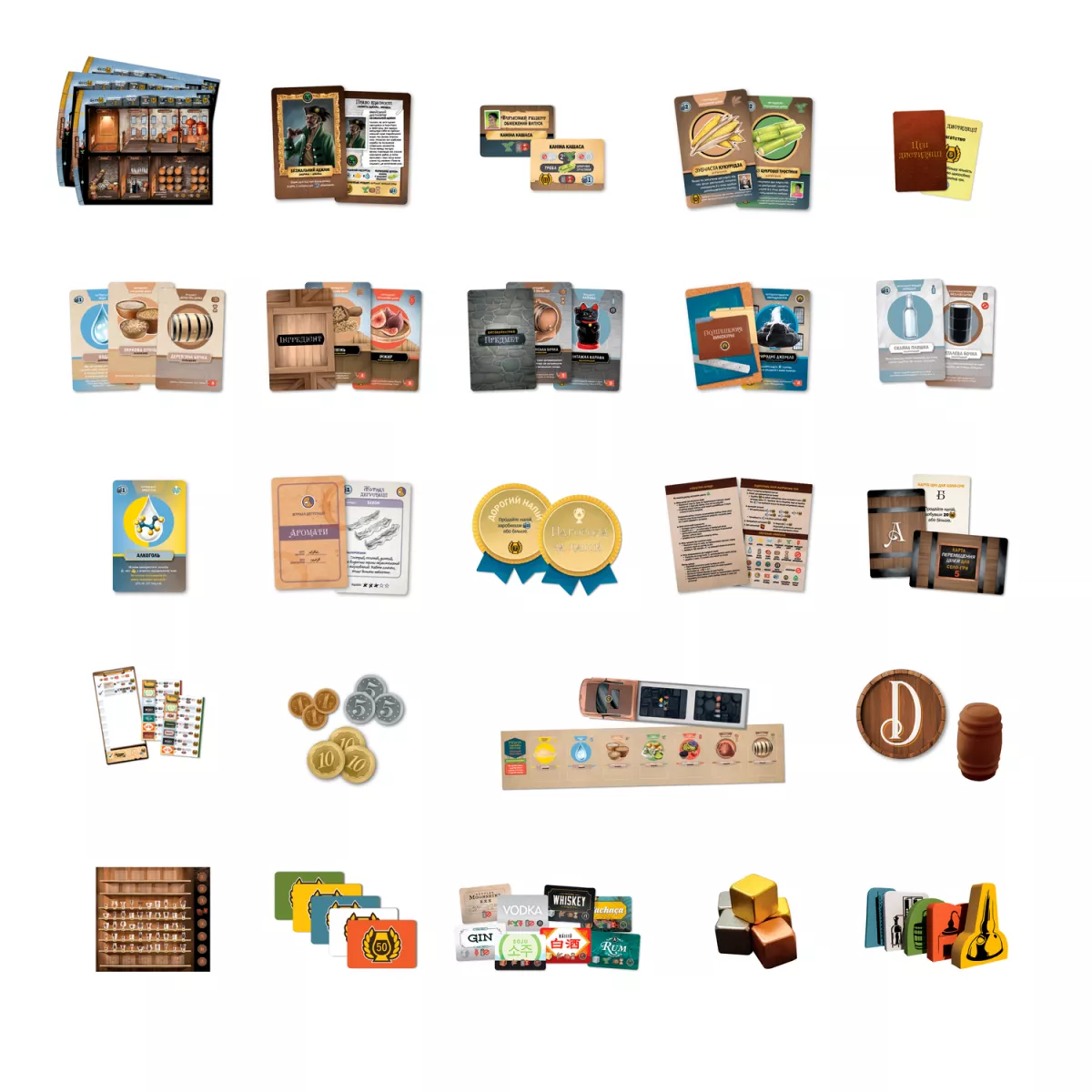У коробці 333 карти (56x87 мм), 187 картонних жетонів, 68 мінікарт (41x63 мм), 43 дерев’яні кубики й фішки, 20 великих карт переліків рецептів, 5 планшетів винокурень, 5 двошарових планшетів рецептів, 5 великих карт-пам’яток гравця, 3 ігрові планшети, 2 книжки правил