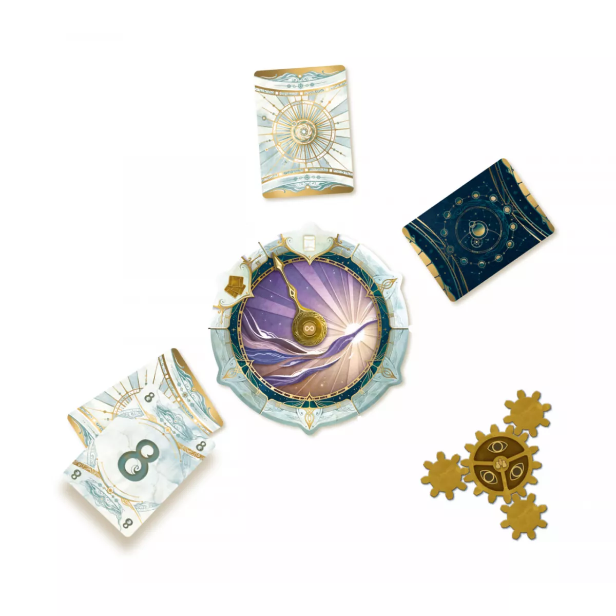 У коробці книжка правил, 12 карт сонця (пронумеровані від 1 до 12), 12 карт місяця (пронумеровані від 1 до 12), 3 жетони нагадування, 3 жетони бонусів, 10 конвертів розділів, кожен з яких містить, 4 годинники та лист правил, 1 годинникова стрілка, 1 конверт жалю, , 1 конверт переродження -, годинник переродження, секундну стрілку та 6 жетонів