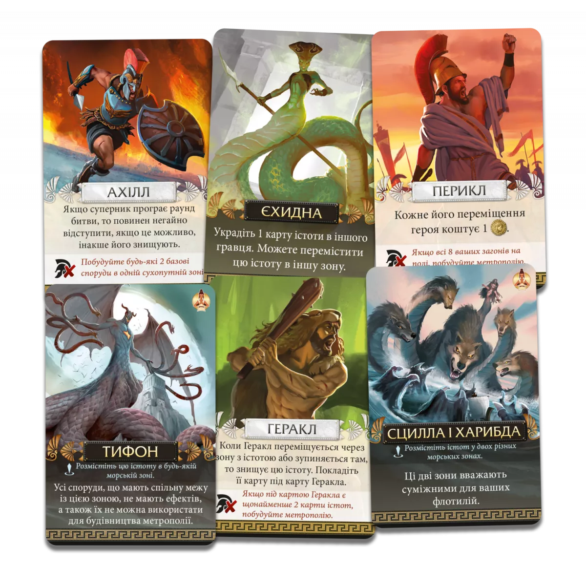 У коробці 7 фігурок істот, 13 карт істот, 7 фігурок героїв, 7 карт героїв, 9 жетонів метрополій (3 різних типів), буклет правил