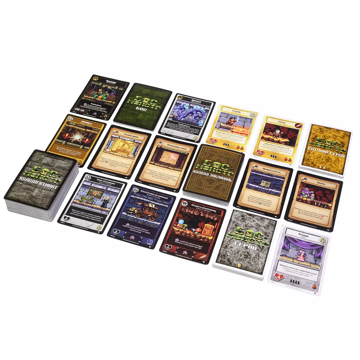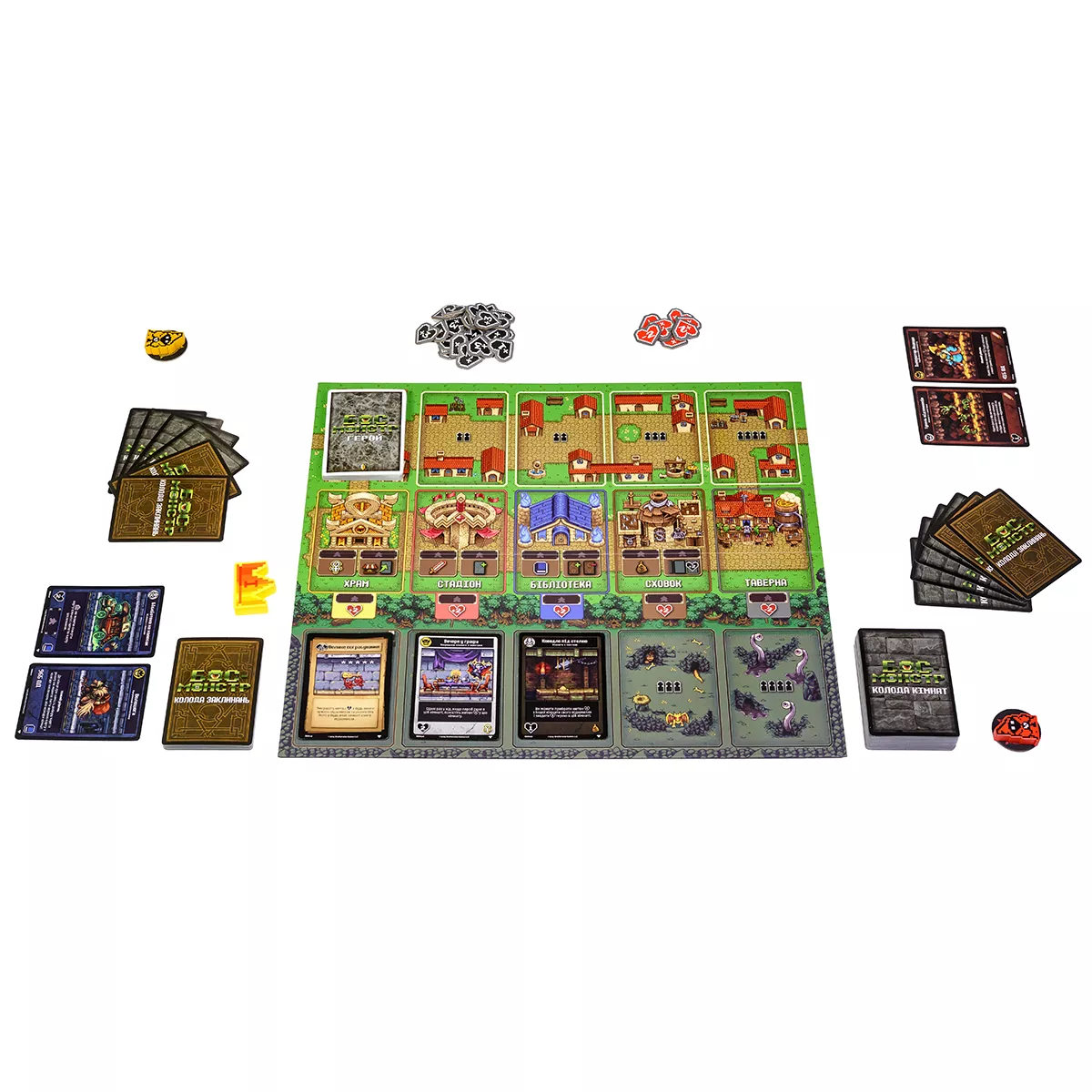У коробці 75 карт кімнат, 32 карти заклинань, 12 карт босів, 25 карт звичайних героїв, 17 карт епічних героїв, 1 маркер першого гравця, 4 посіпаки та їхні 4 бази, 8 жетонів здоров'я героїв, 28 жетонів ушкоджень + 5 жетонів скарбів, 1 двобічне поле міста, правила гри