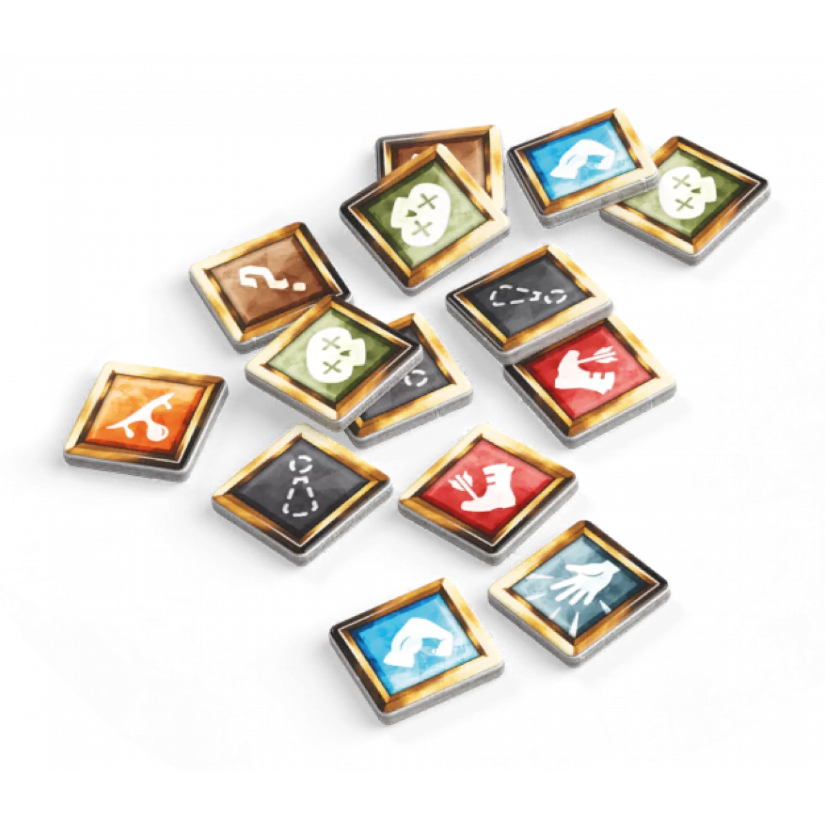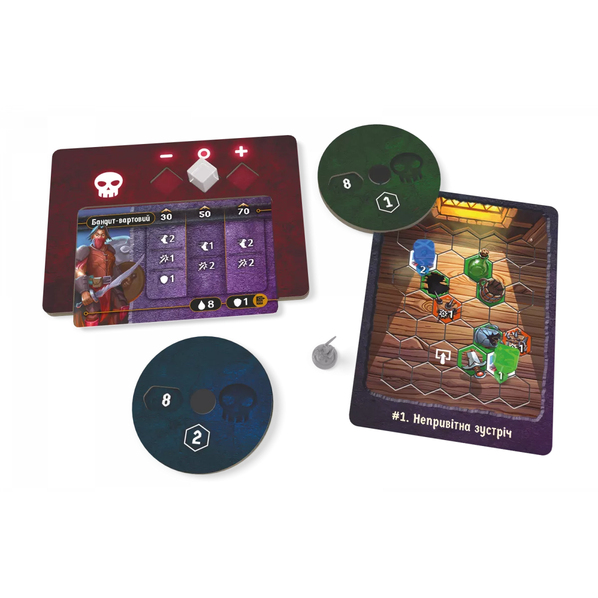 У коробці 6 фігурок, 6 карт персонажів, 48 двосторонніх карт здібностей, 22 карти сценаріїв з мінімапами боїв, 24 жетони станів, 10 двосторонніх карт характеристик монстрів, Правила