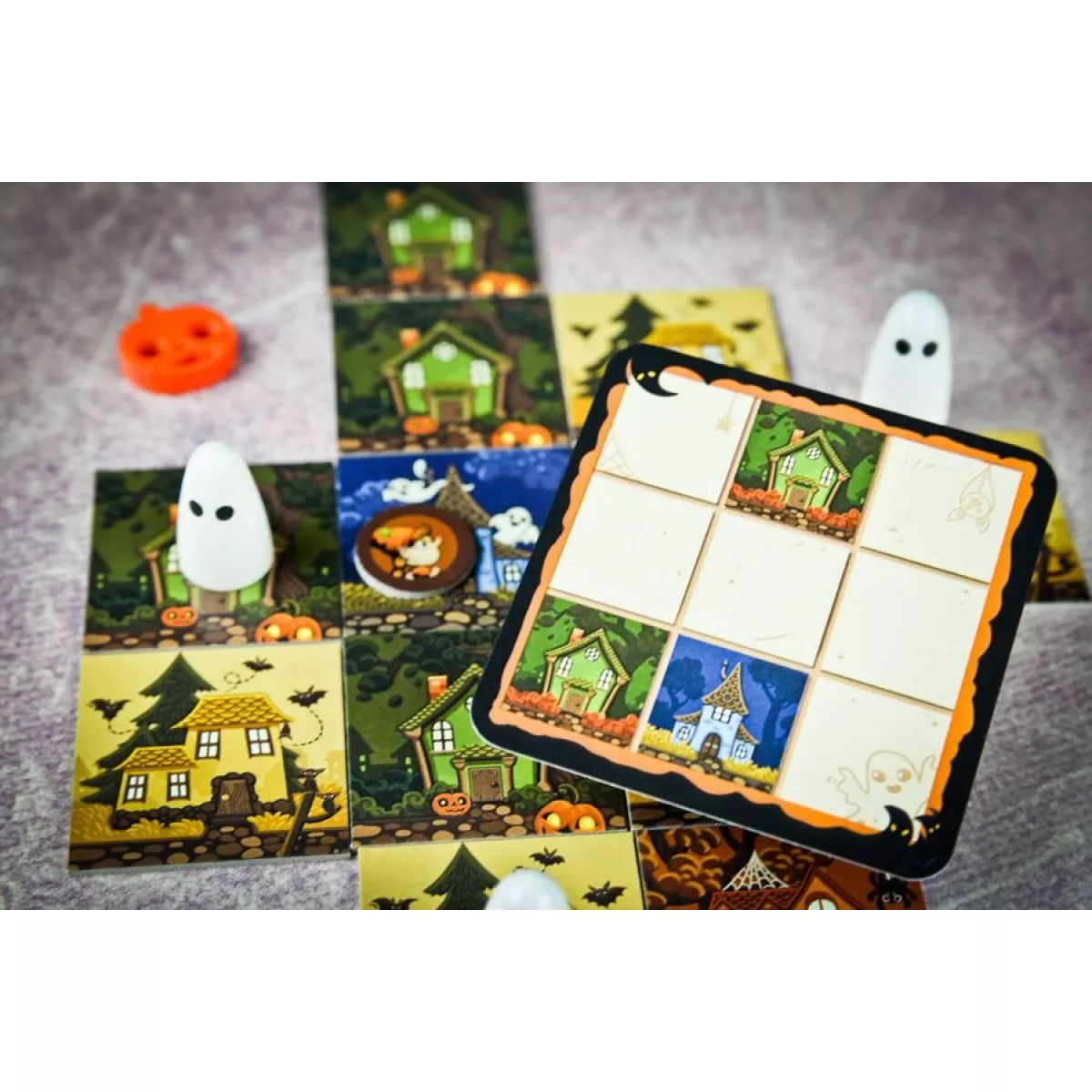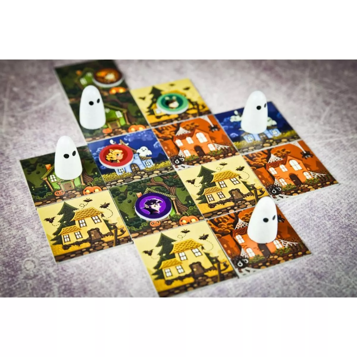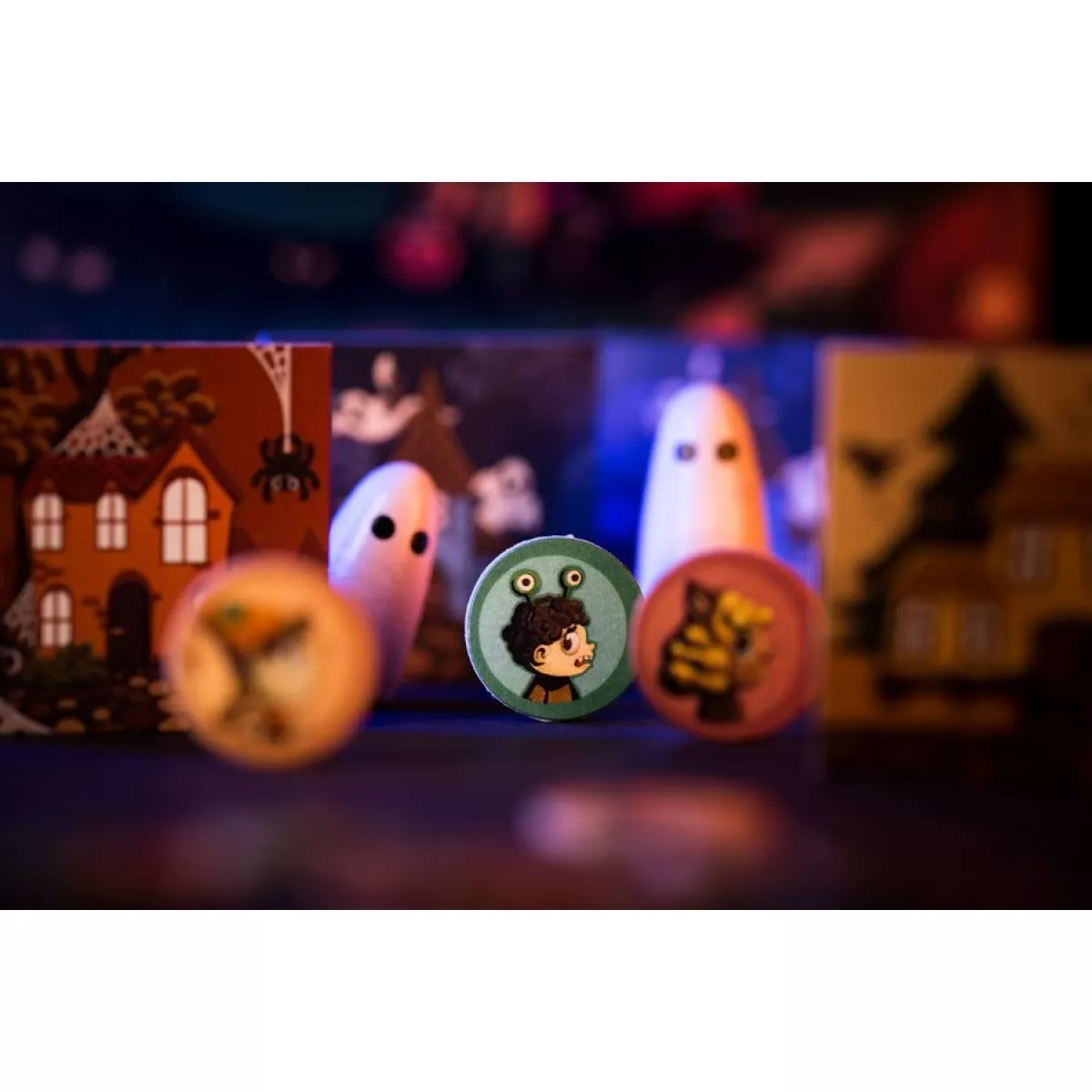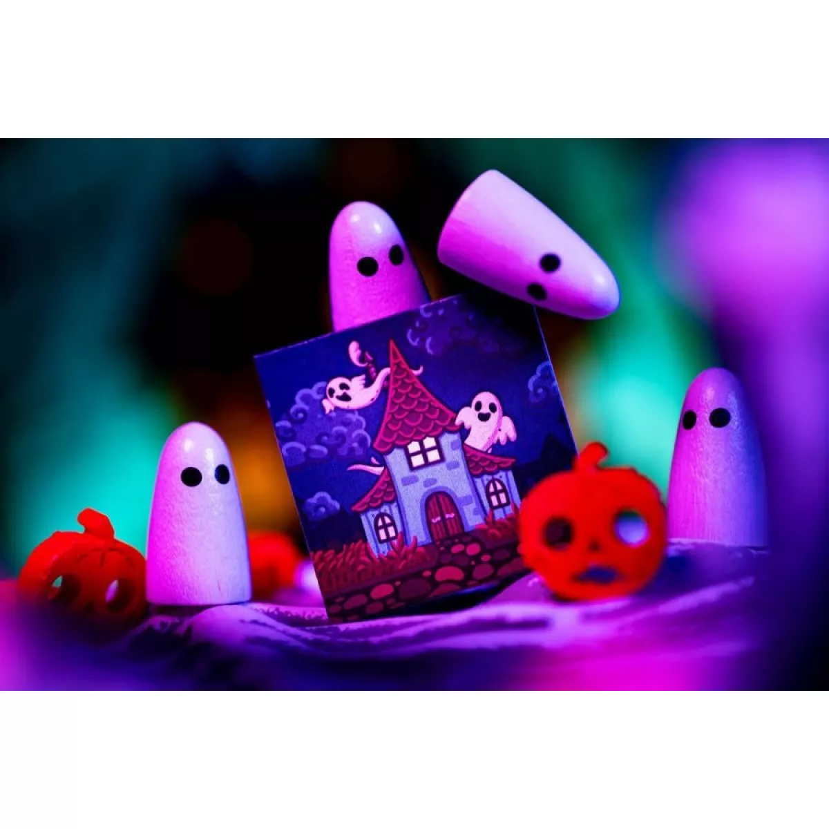 Гелловін не був би Гелловіном без привидів! У свій хід ви можете перемістити фігурку привида на суміжну плитку, зробивши до двох переміщень. Якщо обрана плитка зайнята жетоном дитини або іншою фігуркою, вони переміщуються на сусідню вільну клітинку ланцюговою реакцією, створюючи динамічні ситуації та змушуючи гравців адаптуватися до мінливих умов на полі. Зустріч із привидом несе за собою жетон жаху, який у кінці гри відніме ваші дорогоцінні очки.
