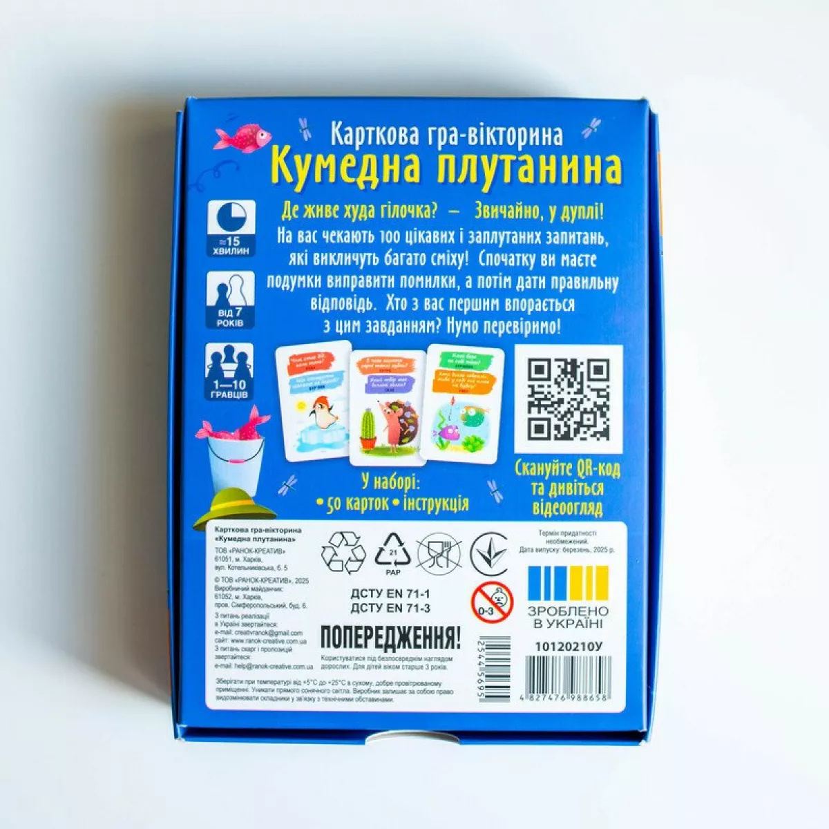 Не дозволяйте нудьзі заполонити ваші вечори! Настільна гра «Кумедна плутанина» – це гарантія яскравих емоцій, інтелектуальних викликів та щирого сміху. Це ідеальний спосіб провести час з родиною та друзями, поєднавши приємне з корисним. Завдяки українській мові, чітким правилам та захопливому ігровому процесу, ця настільна гра стане фаворитом у вашій колекції. Вона подарує вам і вашим дітям безліч годин якісного дозвілля, навчить мислити логічно, швидко реагувати та весело проводити час. Обирайте «Кумедну плутанину» – і розплутайте всі загадки разом з нами!