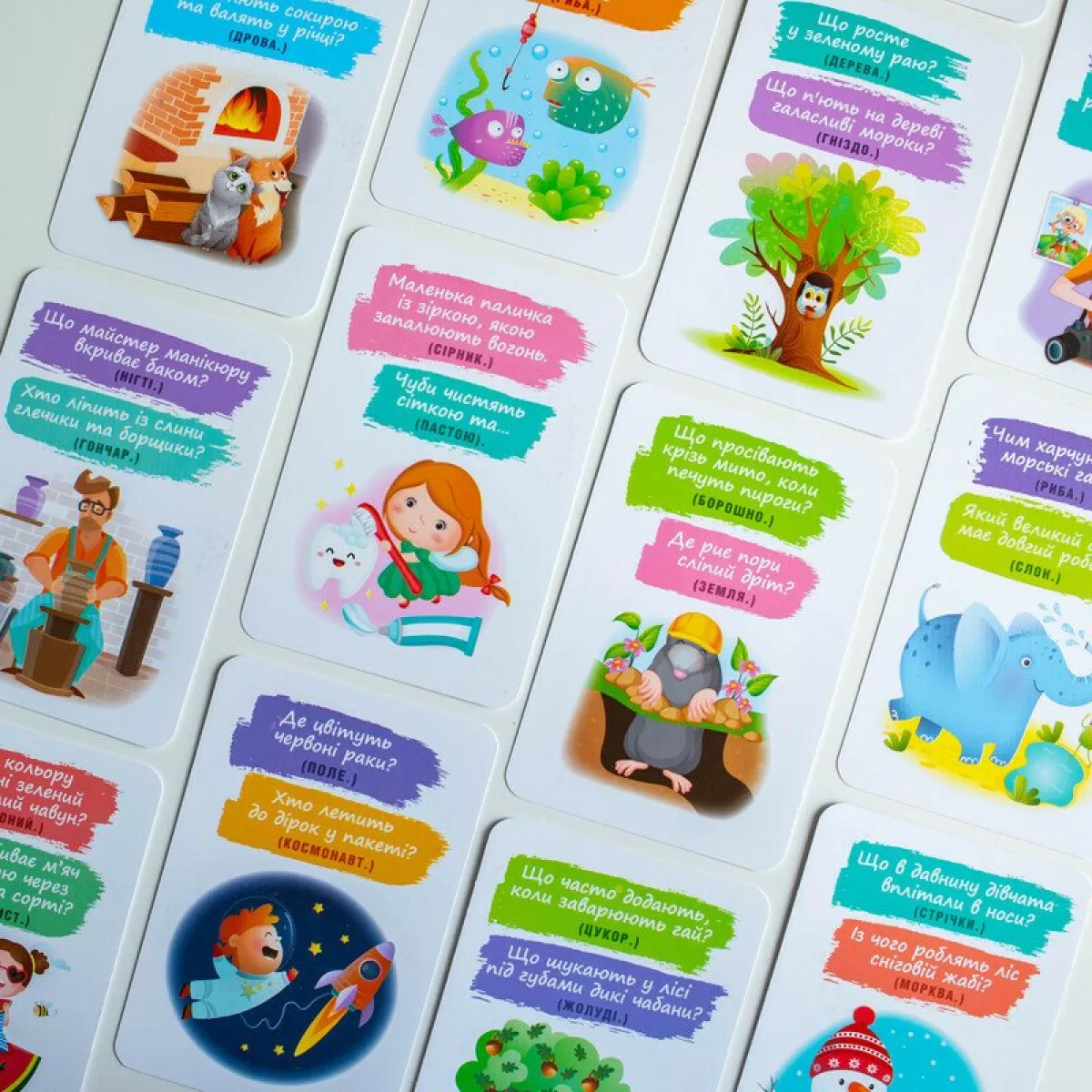 • 50 унікальних карт: Кожна карта містить цікаві загадки, твердження або вікторинні питання, що стимулюють мислення та увагу.