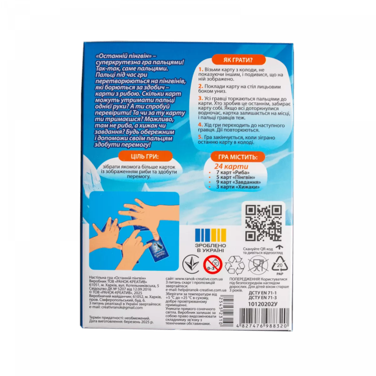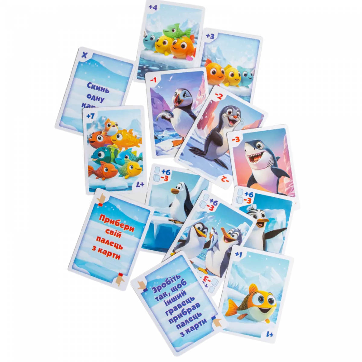 • Мовонезалежна гра: Однією з ключових переваг «Останнього пінгвіна» є її мовонезалежність. Це означає, що, хоча правила написані українською, ігровий текст на картах мінімальний або відсутній, що дозволяє грати в неї людям з різними мовними уподобаннями, після ознайомлення з правилами. Це робить її ідеальною для міжнародних сімей або друзів.