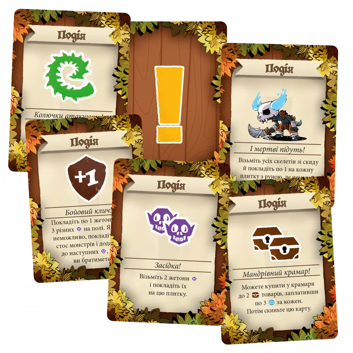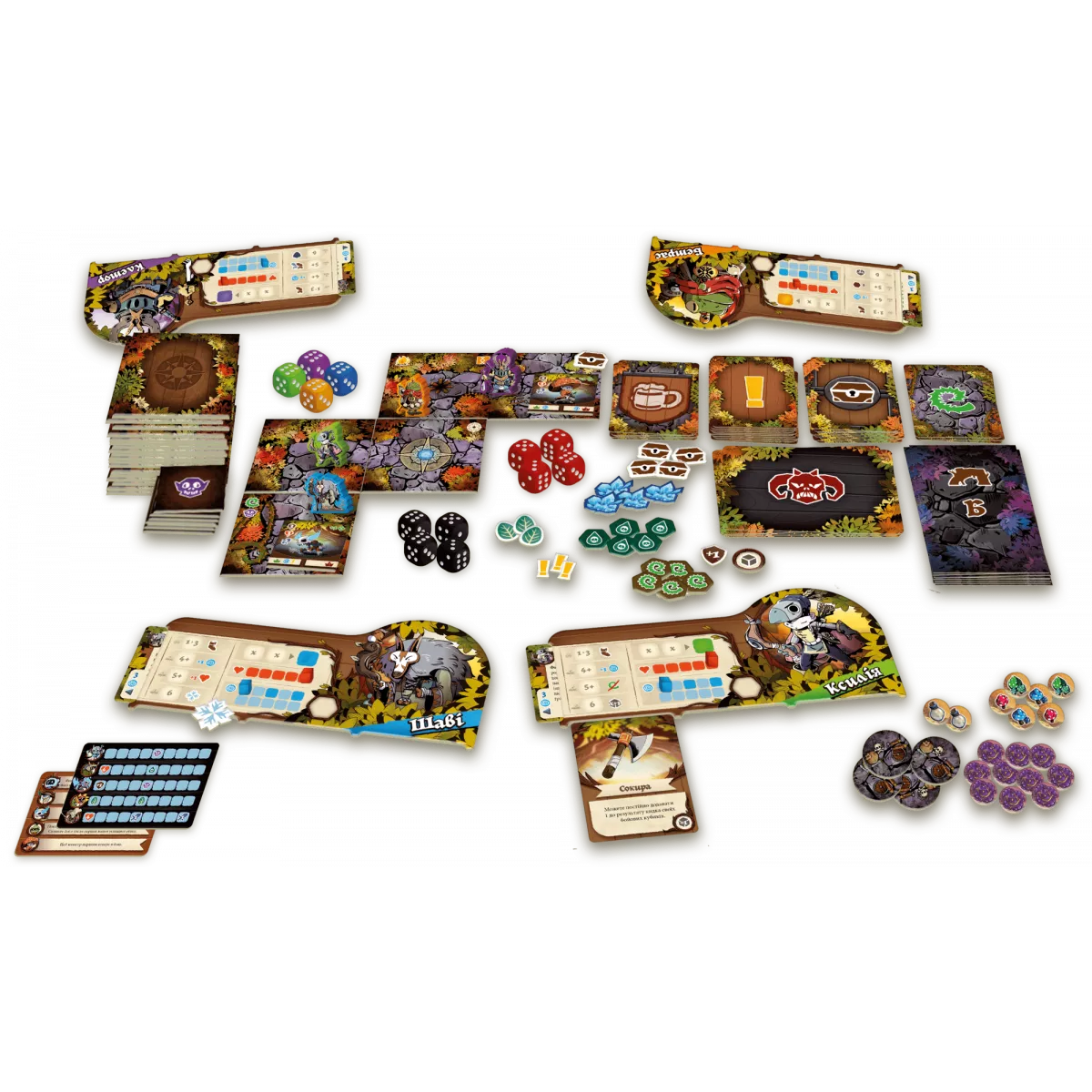У коробці 1 книжка правил, 4 планшети героїв, 4 фігурки героїв, 4 кубики героїв (червоні), 4 бойові кубики (чорні), 4 кубики сили (1 фіолетовий, 1 зелений, 1 синій, 1 оранжевий), 4 червоні маркери, 6 голубих маркерів, 24 плитки лісу, 25 карт здобичі, 12 карт подій, 4 карти вмінь героїв, 8 карт лігвищ, 5 карт корчми, 6 карт ватажків, 3 карти колючок, 1 карта розлючених монстрів, 1 карта розлючених ватажків, 20 жетонів монстрів, 5 жетонів скринь, 3 жетони подій, 5 жетонів отрути, 3 жетони колючок, 4 жетони сфер, 1 жетон морозу, 3 жетони листяних щитів , 1 жетон щита «+1», 1 жетон «+1 бойовий кубик», 22 жетони завдань