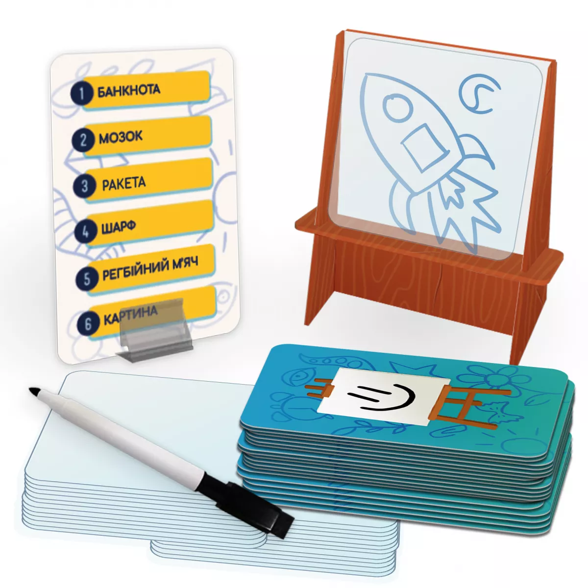 У коробці 91 карта;, 25 прозорих аркушів;, 1 маркер, що стирається;, 1 підставка;, 1 мольберт;, 1 правила гри
