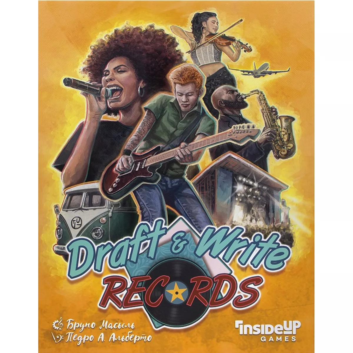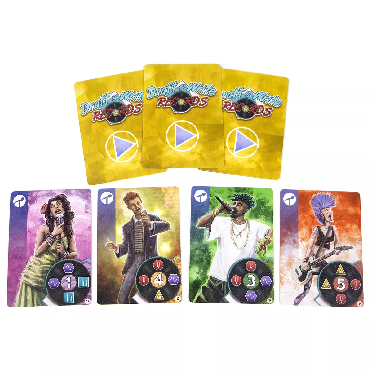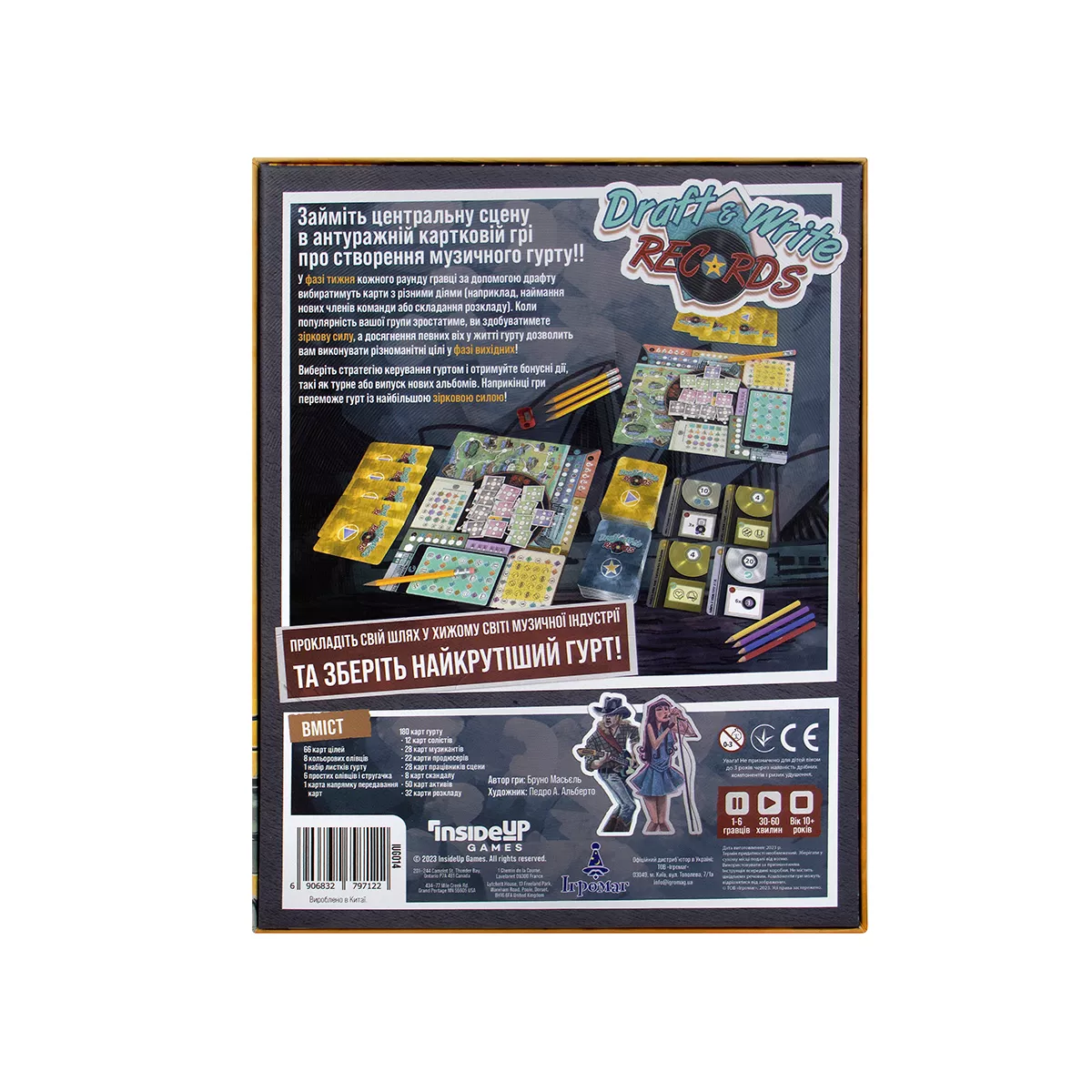 Ви готові запалити стадіони? Ви готові розірвати фанатів гарячими синглами? Ви готові зібрати гурт, який стане настільки легендарним, що всі ваші альбоми стануть діамантовими? Тоді готуйтеся з головою поринути у гру Draft & Write Records, у якій від 1 до 6 гравців будуть збирати свої музичні банди та підніматися від репетицій у гаражі та квартирників у друзів до ТОПу усіх чартів! Аби подолати цей довгий шлях на початку партії кожний гравець отримує планшет, на якому буде замальовувати успіхи та досягнення свого гурту. Кожна подія буде розіграна відповідно до карти, яку обере гравець, це можуть бути: Музиканти у гурті (це ж не лише гітарист та вокаліст, потрібно ще зібрати композиторів, беквокалістів, працівників сцени та бекстейджу. І чим краще вони поєднуються між собою – тим чистішою буде гармонія) Налаштування гармонії (для отримання абсолютно різних винагород) Запис платівки або синглу (аби отримати якнайбільше слави та грошиків) Планування заходів у календарі (які принесуть винагороду, якщо зібрати серію подій) Або навіть участь у скандалі! (переможних очків ця подія відніме багацько, але натомість надасть вдосталь грошей) А гроші нащо треба? За них можна розширити гурт, або поїхати в турне! І ця поїздка також принесе нових фанатів, досягнення, або допоможе виконати завдання. Ще й завдання? Так! Але це саме те, що буде приносити гурту славу, а вам винагороду. Коли карти на руках гравців закінчуються, настають довгоочікувані «вихідні». У цей час всі гравці можуть порівняти свої досягнення із завданнями і отримати переможні очки. І коли один з гравців виконає 6 завдань, збере всіх членів гурту або засвітиться у 5 скандалах – значить цей ігровий раунд буде останній і настав час підсумовувати результати та визначати найбільш успішого менеджера у музичному світі! Тож якщо ви з самого дитинства хотіли взяти стареньку гітару, зібрати друзів у старому гаражі, вдарити по струнах та, можливо, стати справжньою зіркою – вам варто придбати гру Draft & Write Records та втілити мрії хоча б на папері. Коли ж ви бажаєте швидшого ігроладу, щоб зали збиралися на ваші концерти буквально за 10 хвилин – зверніть увагу на веселий та енергійний філлер Збери гурт.