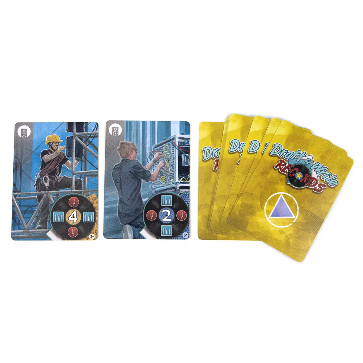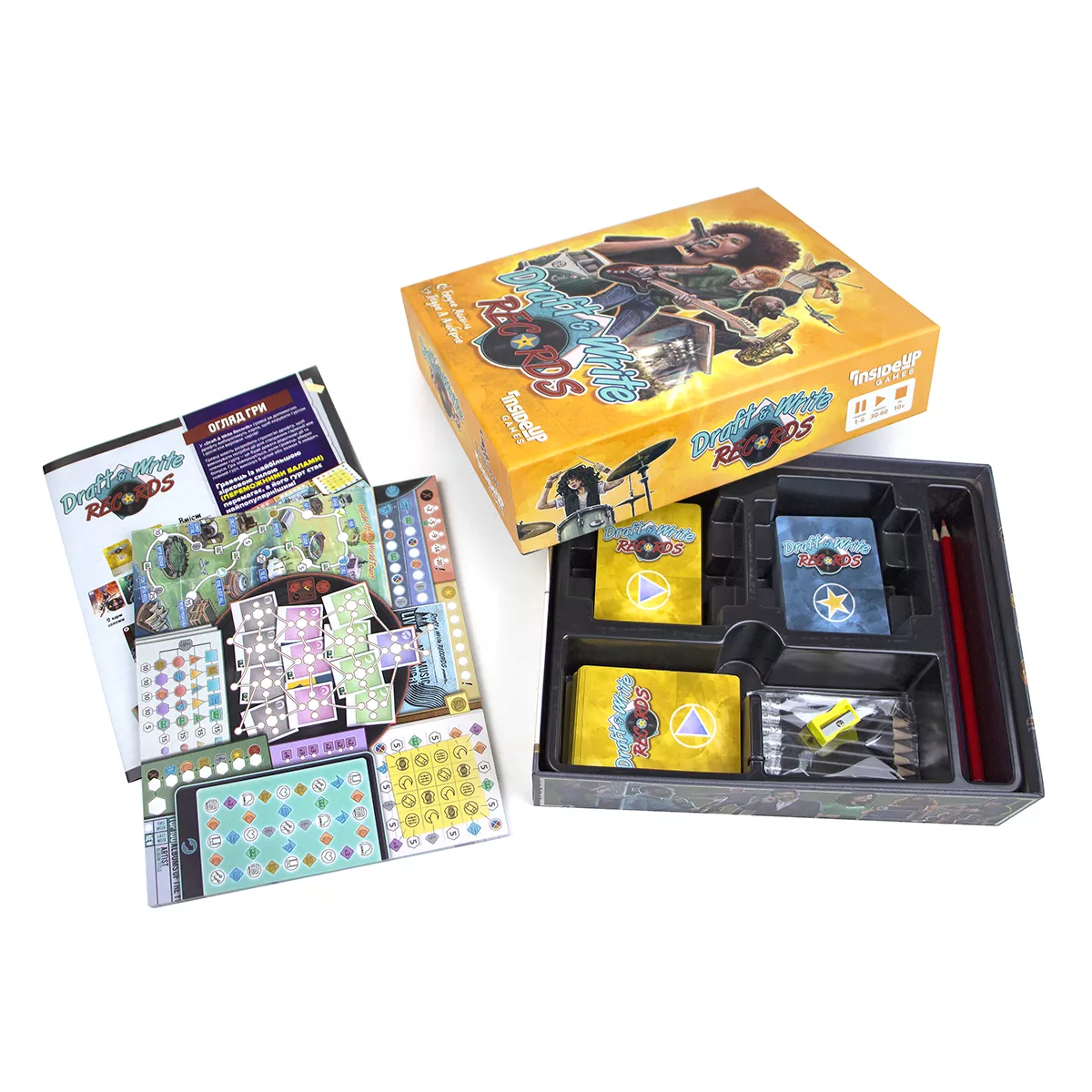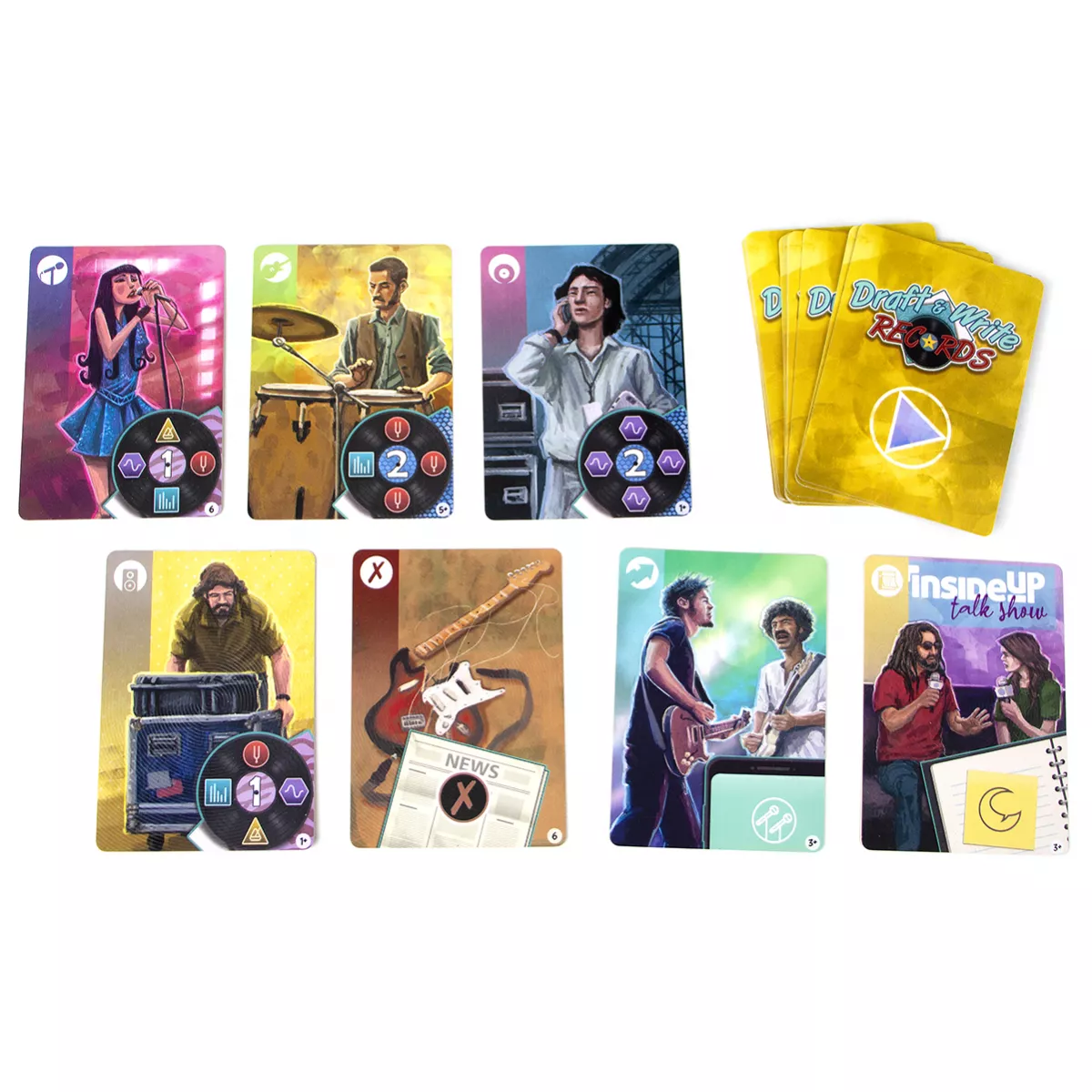 Ви готові запалити стадіони? Ви готові розірвати фанатів гарячими синглами? Ви готові зібрати гурт, який стане настільки легендарним, що всі ваші альбоми стануть діамантовими? Тоді готуйтеся з головою поринути у гру Draft & Write Records, у якій від 1 до 6 гравців будуть збирати свої музичні банди та підніматися від репетицій у гаражі та квартирників у друзів до ТОПу усіх чартів! Аби подолати цей довгий шлях на початку партії кожний гравець отримує планшет, на якому буде замальовувати успіхи та досягнення свого гурту. Кожна подія буде розіграна відповідно до карти, яку обере гравець, це можуть бути: Музиканти у гурті (це ж не лише гітарист та вокаліст, потрібно ще зібрати композиторів, беквокалістів, працівників сцени та бекстейджу. І чим краще вони поєднуються між собою – тим чистішою буде гармонія) Налаштування гармонії (для отримання абсолютно різних винагород) Запис платівки або синглу (аби отримати якнайбільше слави та грошиків) Планування заходів у календарі (які принесуть винагороду, якщо зібрати серію подій) Або навіть участь у скандалі! (переможних очків ця подія відніме багацько, але натомість надасть вдосталь грошей) А гроші нащо треба? За них можна розширити гурт, або поїхати в турне! І ця поїздка також принесе нових фанатів, досягнення, або допоможе виконати завдання. Ще й завдання? Так! Але це саме те, що буде приносити гурту славу, а вам винагороду. Коли карти на руках гравців закінчуються, настають довгоочікувані «вихідні». У цей час всі гравці можуть порівняти свої досягнення із завданнями і отримати переможні очки. І коли один з гравців виконає 6 завдань, збере всіх членів гурту або засвітиться у 5 скандалах – значить цей ігровий раунд буде останній і настав час підсумовувати результати та визначати найбільш успішого менеджера у музичному світі! Тож якщо ви з самого дитинства хотіли взяти стареньку гітару, зібрати друзів у старому гаражі, вдарити по струнах та, можливо, стати справжньою зіркою – вам варто придбати гру Draft & Write Records та втілити мрії хоча б на папері. Коли ж ви бажаєте швидшого ігроладу, щоб зали збиралися на ваші концерти буквально за 10 хвилин – зверніть увагу на веселий та енергійний філлер Збери гурт.