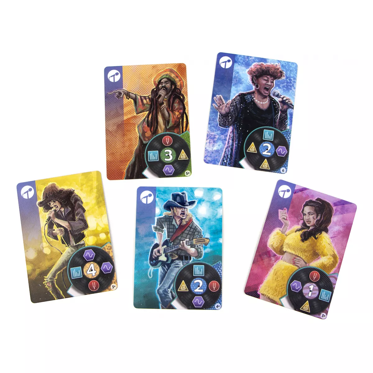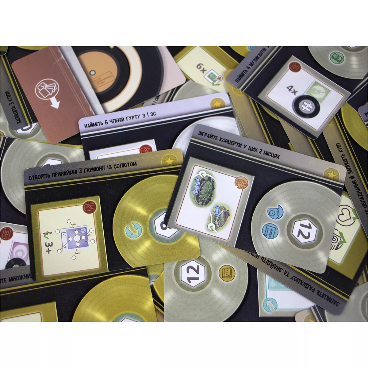 У коробці 180 карт, 90 карт гуртів -, 12 карт солістів, 28 карт музикантів, 22 карт виробничого персоналу, 28 карт закулісних працівників, 1 карта напряму ходу, 66 карти цілей -, 42 золоті, 21 платинові, 22 діамантові, 8 Скандалів, 50 активів -, 30 одинарних опцій, 20 подвійних опцій, 32 план дій -, 20 одинарних опцій, 12 подвійних опцій, 4 кольорові олівці (синій, жовтий, червоний та фіолетовий), 6 олівців, 1 ластик, 1 блокнот