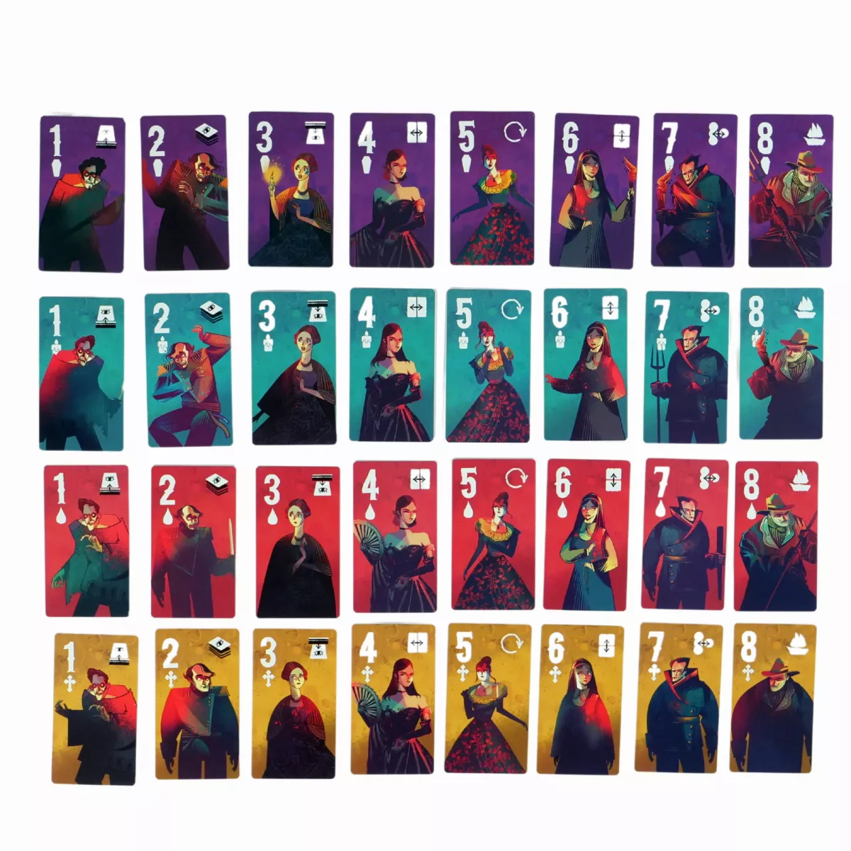 У коробці 32 картки, 2 тримачі карток, 20 жетонів людей / вампірів, 1 планшет рейтингу кольорів, 1 поле міста, 12 жетонів очок здоров’я, 1 маркер корабля, 4 жетони кольорів