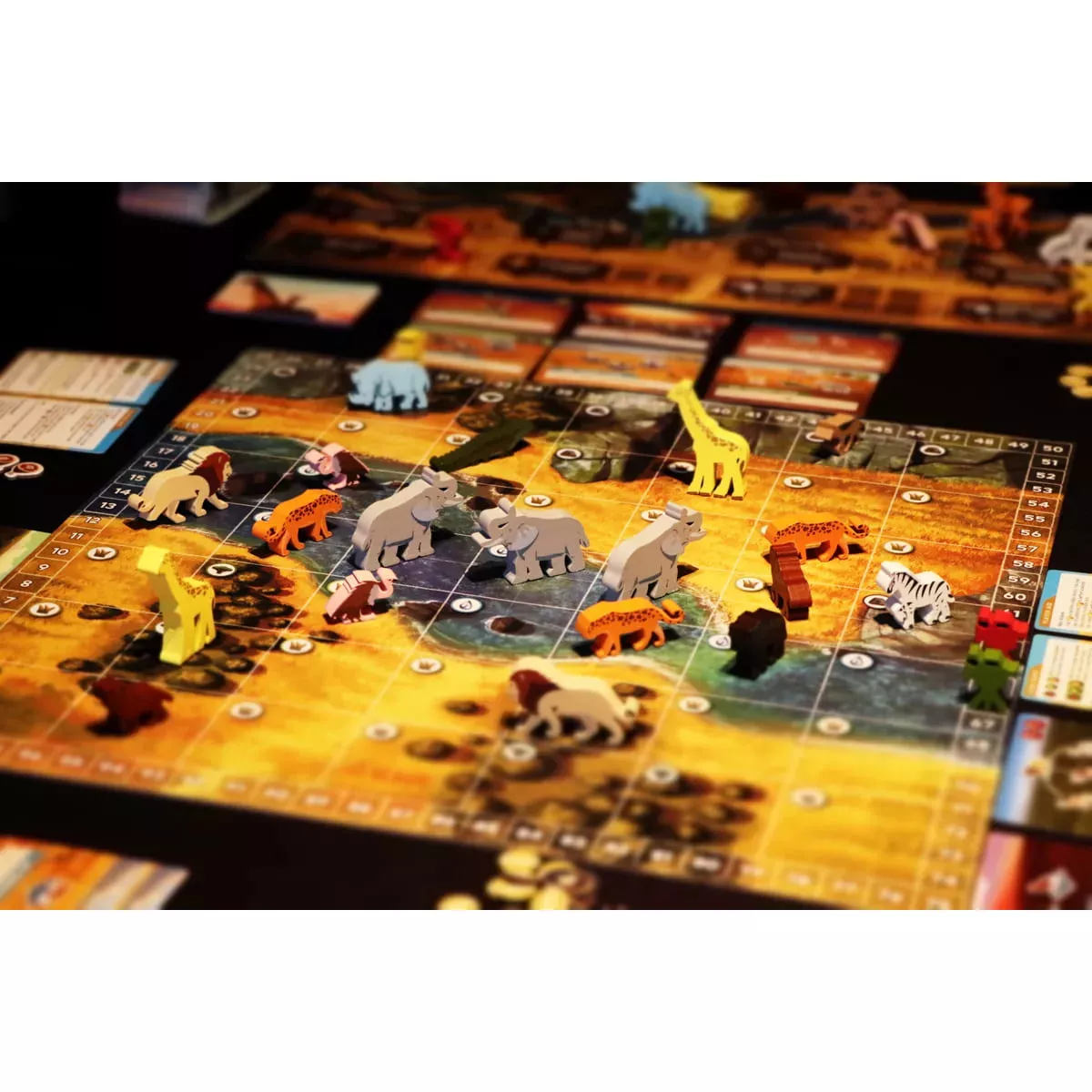 У коробці 3 леви, 3 жирафи, 3 газелі, 3 носороги, 3 шакали, 3 леопарди, 3 крокодили, 3 слони 3 антилопи гну, 3 гієни, 3 стерв’ятники, 3 зебри, 1 маркер раунду, 1 Скеля епох, 1 поле дій, 1 ігрове поле, 4 жетони очок, 8 маркерів гравців, 4 панелі відеогалереї, 4 пам’ятки гравця, 1 правила, 8 жетонів замка, 12 плиток нагород, 1 маркер першого гравця 168 карт сцен, 12 карт Великої міграції, 40 жетонів їжі, 50 монет, 40 жетонів спецефектів, 14 карт спеціалістів