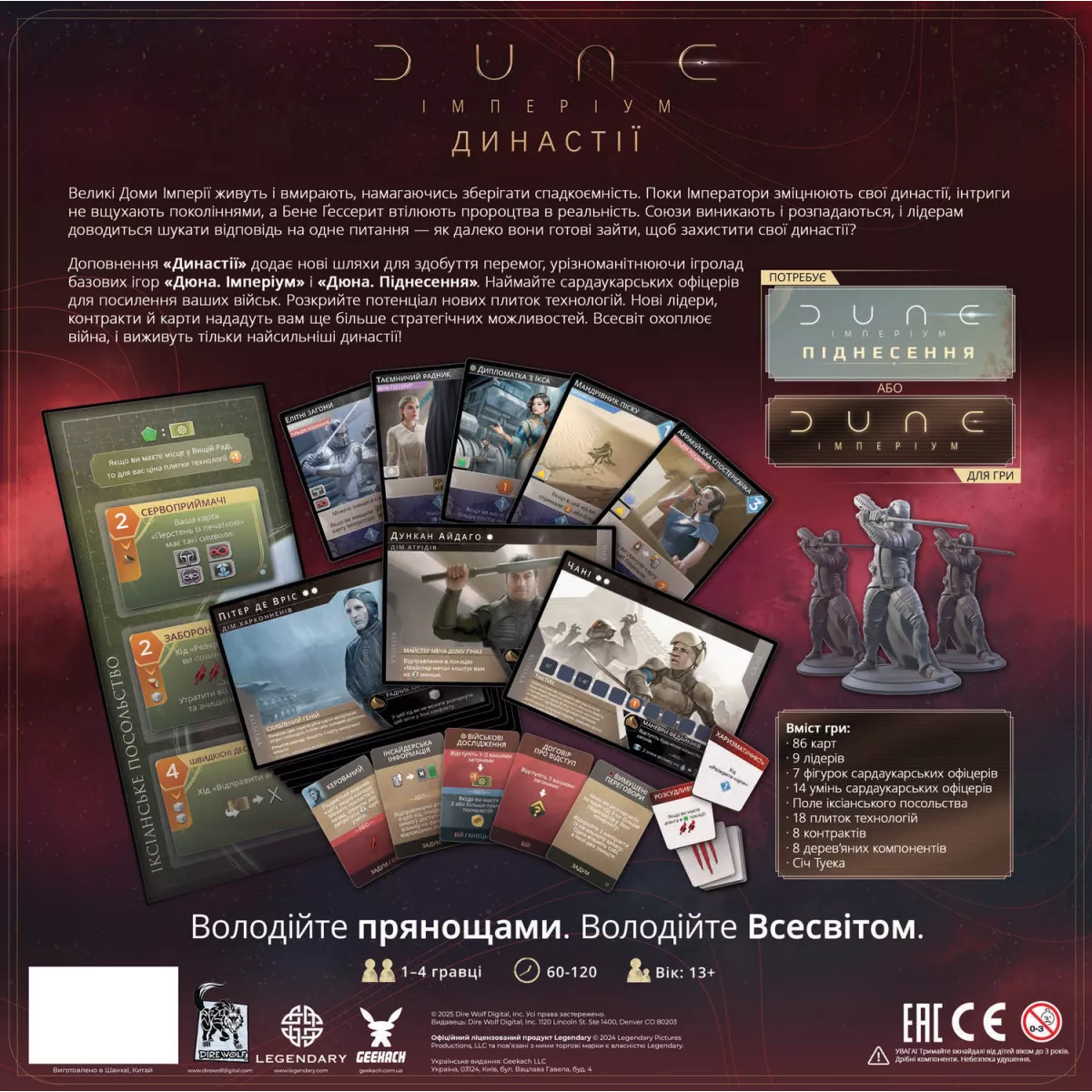 «Дюна. Імперіум — Династії» — це доповнення для ігор «Дюна: Імперіум» і «Дюна: Імперіум — Піднесення», яке розширює ігролад новими потужними інструментами для досягнення перемоги. Ви будете наймати командирів сардаукарів, щоб посилити свою військову міць, і досліджувати нові плитки технологій. Вас чекатимуть дев’ять нових лідерів з унікальними властивостями, карти Імперіуму й інтриг, контракти й навіть нова локація, яку використовують у грі з одним із лідерів цього доповнення.
