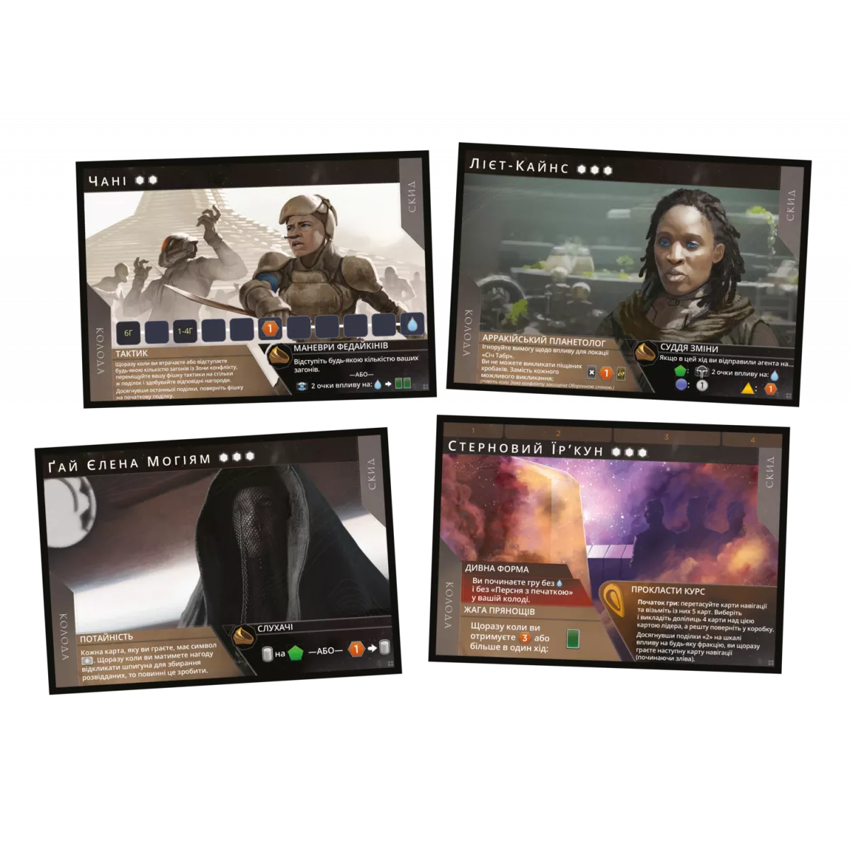 У коробці 86 карт , 9 лідерів , 7 фігурок сардаукарських офіцерів , 14 умінь сардаукарських офіцерів , Поле іксіанського посольства , 18 плиток технологій , 8 контрактів , 8 дерев'яних компонентів , Січ Туека
