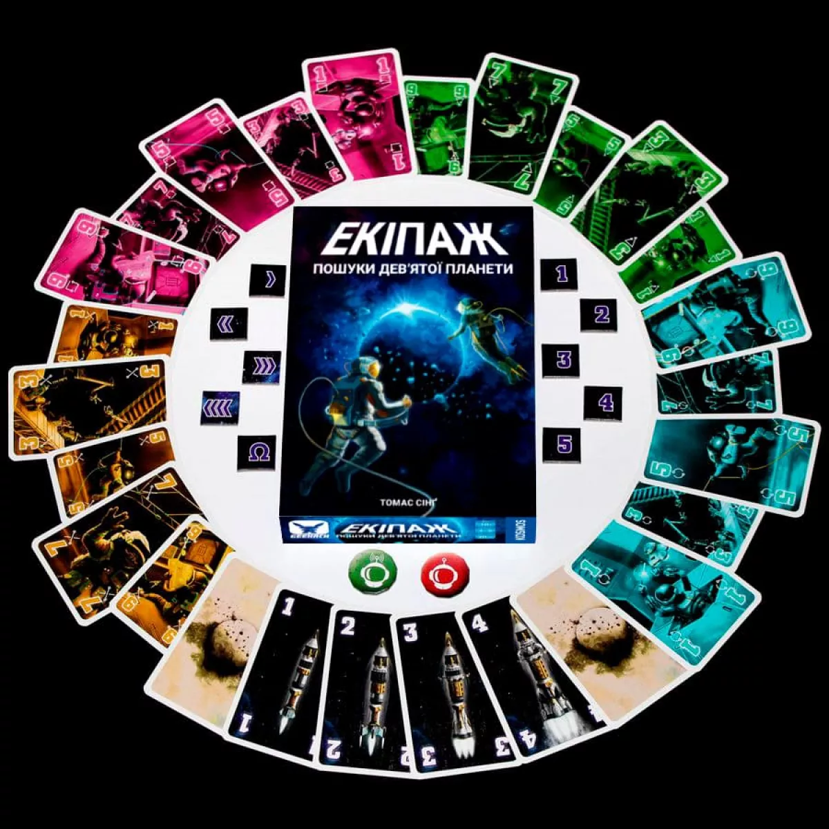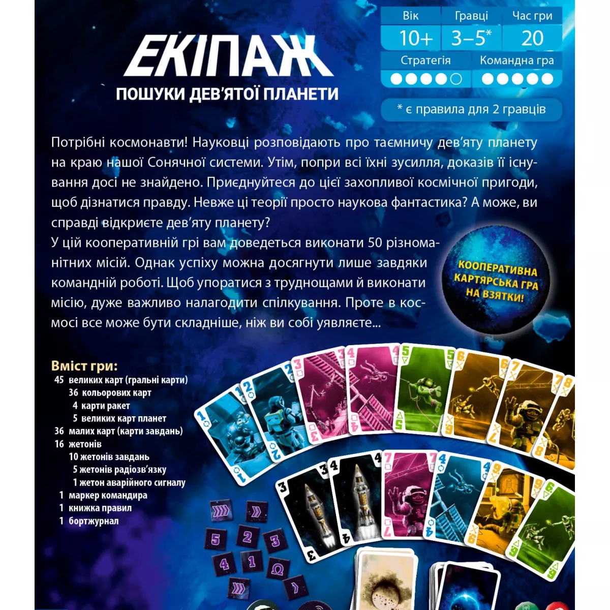 Вчені висувають теорію, що десь у межах нашої Сонячної системи може ховатися дев'ята планета. Давайте вирушимо в таємничу експедицію і перевіримо, чи це так насправді. Швидше надягайте скафандри, на вас чекає незабутня пригода. І навіть якщо теорія вчених виявиться вигадкою – не біда, адже дослідження космічних просторів і так є гідною нагородою. У цій захоплюючій грі на вас чекають карти та 50 неймовірних місій – поступово вони будуть занурювати вас у таємниці пошуку заповітної планети. Проходження кожної місії складатиметься в одну унікальну пригоду. Залежно від порядку проходження завдань, щоразу на вас чекає нова історія. Вам навіть не обов'язково проходити всі доступні місії, можете вибрати деякі, та й взагалі – грати, як заманеться. Але не сподівайтеся, що перемога близька - для успішного завершення гри вам знадобиться злагоджена робота всієї команди та точне виконання індивідуальних цілей, що в космосі зробити не так просто. Екіпаж – це цікава гра з масою сюрпризів. Здавалося б, проста карткова гра з хабарями, але творці урізноманітнили її місіями та особливими умовами. А ще в космосі не можна спілкуватися з командою традиційним способом, лише за допомогою спеціальних жетонів. Чи зможете ви впоратися із завданнями у цих непростих умовах?