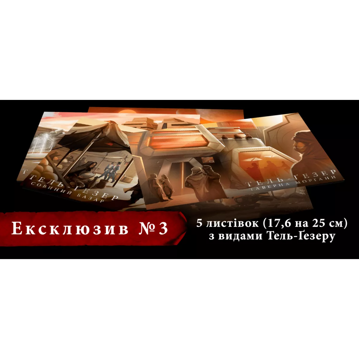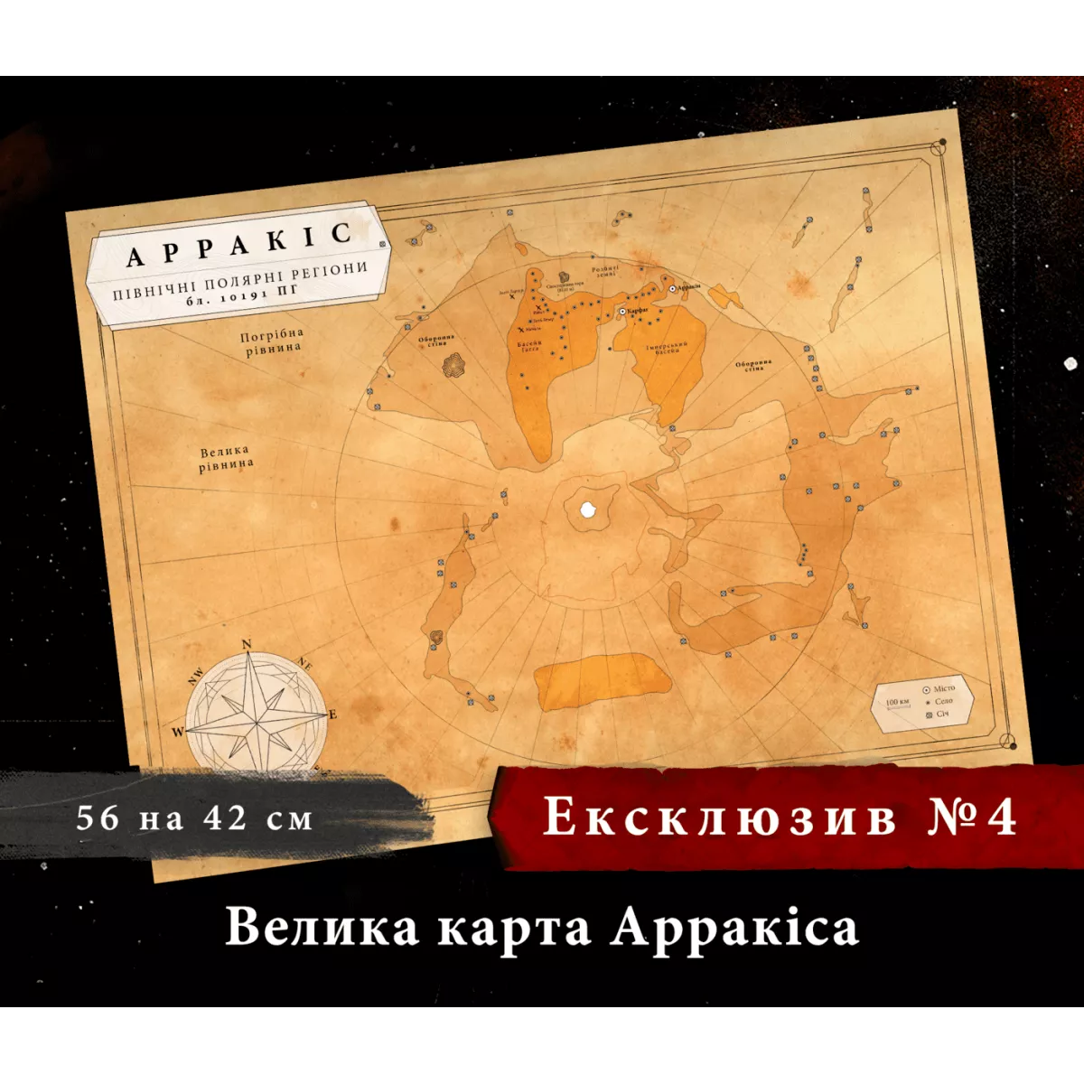 У коробці 4 передісторії персонажів;, 12 секретних повідомлень для героїв;, 5 листівок (17,6 на 25 см) з видами Тель-Ґезеру;, велика карта Арракіса (56 на 42 см),, тематичний мішечок і 4 дерев'яні фішки з символами.