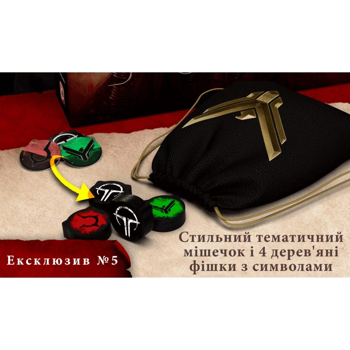 Увага! Це бонуси. Для гри потрібна гра Дюна. Таємниці Домів. Набір ексклюзивних промо-матеріалів для настільної гри Дюна. Таємниці Домів. У комплекті: 4 розширені передісторії персонажів; секретні повідомлення для персонажів, які читаються перед місіями (3 повідомлення для кожного героя); 5 листівок (17,6 на 25 см) з видами Тель-Ґезеру: панорама міста, маєток Сорко, Совиний базар, таверна Морґани, Орніпорт; велика карта Арракіса (56 на 42 см); стильний тематичний мішечок і 4 дерев'яні фішки з символами. Видавництво Joy запевняє, що цей набір стане відмінним подарунком для фанатів «Дюни» - він прекрасно доповнює базову гру Дюна. Таємниці Домів і розширює всесвіт Дюни. Передісторії персонажів 4 буклети містять дивовижні історії з недавнього минулого героїв: про те, як шпигунка Арія Хорас потрапила в халепу; про запеклий бій загону Даніеля Аріаса з силами Харконненів; про інформатора фрименів Джаведа Дхара, що прагне спокутувати провину; а також про останній день на свободі контрабандистки Ґори Маллік.