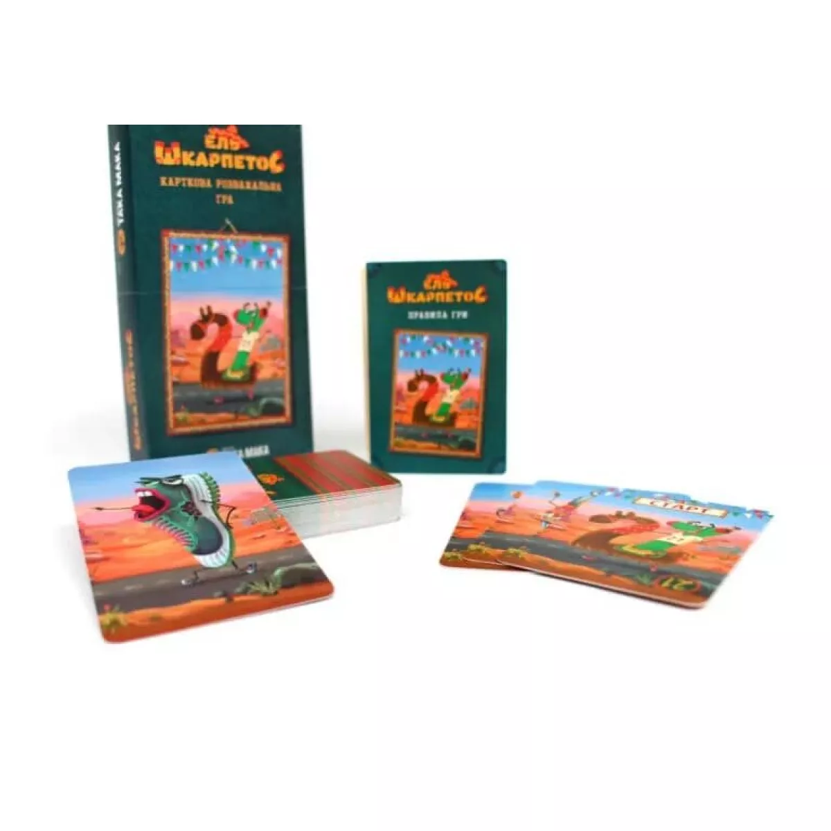Ніде у світі не відбувається такої веселої та цікавої спортивної події, як у містечку Делакруз. Там проходить всесвітній ультрамарафон ‒ найграндіозніший забіг у світі. А знаєте, що саме робить його таким особливим? Учасники! Бігти цей ультрамарафон будуть веселі та по-спортивному заряджені Шкарпетоси. Вони максимально ретельно готувались до цього забігу, тож готові порватися, але першими добігти до фінішу. Вас ми до цього змагання, на жаль, допустити не можемо. Ви ж не Шкарпетос! Але тренувати команду з декількох спортсменів вам можна, тож пора її збирати. У настільній грі Ель Шкарпетос потрібно проявити трішки математичних здібностей, щоби назбирати ідеальну команду задля перемоги у цій гонці. Виграє тільки хтось один, тож доведеться діяти швидко та розумно. Звання найкращого тренера на марафоні отримує… Ель Шкарпетоc ‒ це швидка карткова настільна гра для всієї сім'ї, у якій потрібно швидше за інших назбирати перед собою необхідне число. На початку партії це 21, але з часом воно може змінюватися. Та й існує імовірність, що якийсь із опонентів переманить одного із ваших Шкарпетосів до своїх рядів. Отож, на початку партії кожен учасник (яких може бути від двох до шести) отримає по 3 карти із загальної колоди. Більшість карт, а саме 40, складають самі Шкарпетоси із числами від 1 до 10. Але є й особливі Кросівки-переманювачки, які дозволяють забирати карти у суперників собі на руки. Це досить хитрий спосіб заважати опонентам, адже вони можуть занадто сильно наблизитися до перемоги. У свій хід ви можете виконати одну з трьох дій. Перша найпростіша ‒ викласти карту перед собою, яка й буде наближати вас до потрібного числа. Друга дія ‒ це збільшити загальну ціль, доклавши до карти «Старт-21» щось зі своєї руки. Обмежень ніяких немає, тож загальне число може постійно все збільшуватися і збільшуватися. Ну й остання дія ‒ скористатися Кросівками-переманювачками, щоби викрасти якесь із чисел у суперника та забрати собі в руки. На старт, увага, побігли, Шкарпетоси! Настільна гра Ель Шкарпетоc чудово підійде для сімейного дозвілля, адже пропонує учасникам нескладний і неймовірно азартний ігровий процес. Усе, що вам потрібно ‒ це грамотно рахувати свої карти та слідкувати за досягненням цілі опонентами. Так, Шкарпетосів потренували, пора зайнятися й динозаврами в настільній грі Діно Батл. Який з видів виживе і домінуватиме?