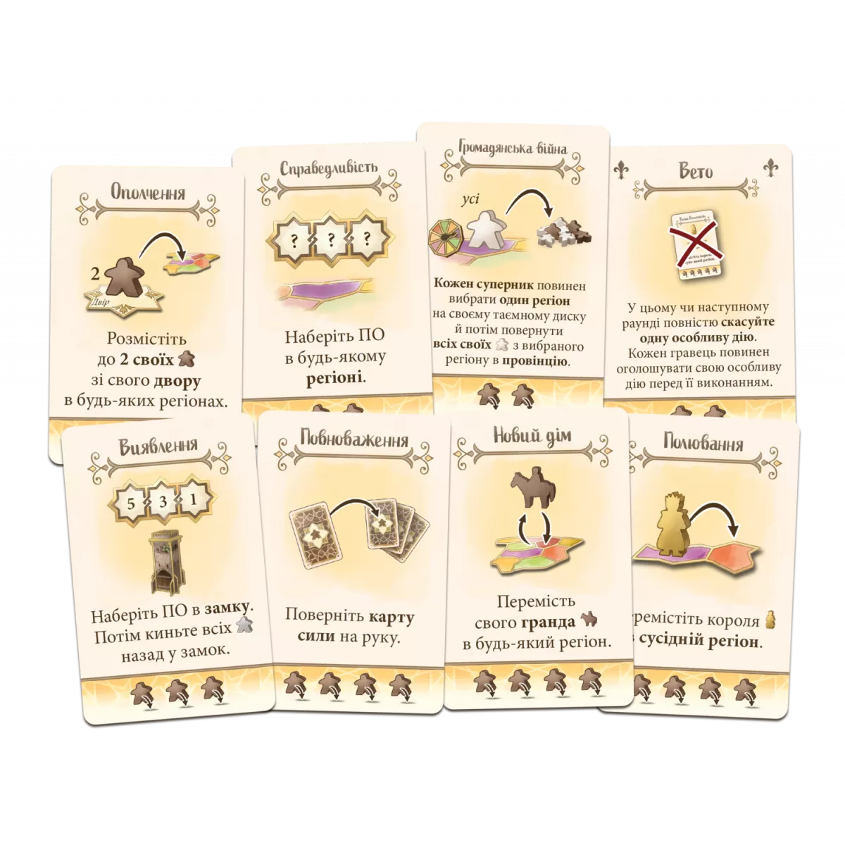 Ходи гравців. Гравці ходять по черзі залежно від номіналу зіграних карт впливу (гравець із найменшим номіналом ходить останнім). Під час свого ходу гравець спершу має перемістити до "суду" відповідну кількість кабальєро. Після цього він обирає карту дії та виконує два її ефекти. Перший ефект буде особливим для кожної карти: ви зможете переміщувати кабальєро чи навіть короля, накладати вето на дії інших гравців або й напряму впливати на їхні переміщення тощо. Пам'ятайте: регіон, у якому перебуває фігурка короля, є "замороженим" й із ним можна взаємодіяти тільки за прямої вказівки у тексті карти. А ось друга дія дозволить вам перемістити із "суду" певну кількість кабальєро до сусідніх від королівської провінцій. Ви можете виставити фігурки у декілька провінцій на вибір.