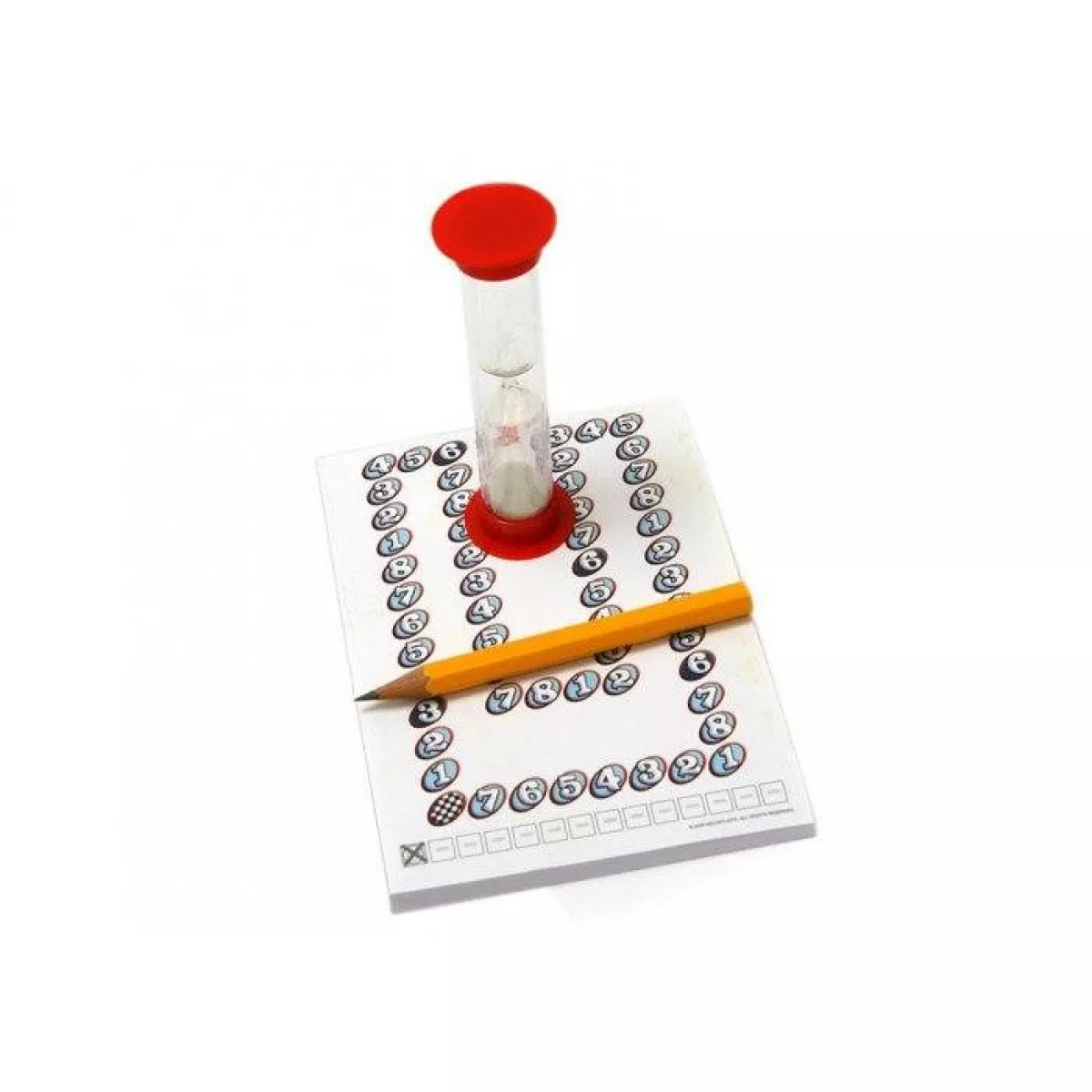 У коробці 50 двосторонніх карток, блокнот для записів із зображенням ігрового поля, пісочний годинник, олівець, правила гри