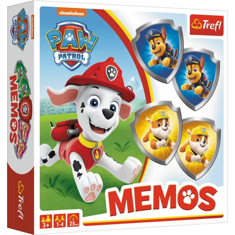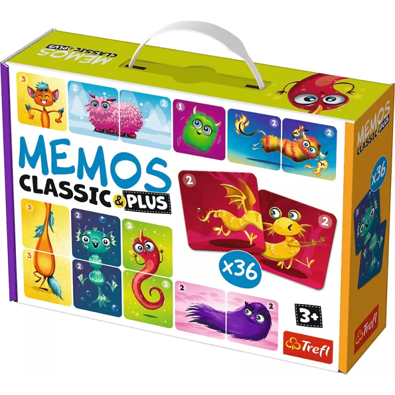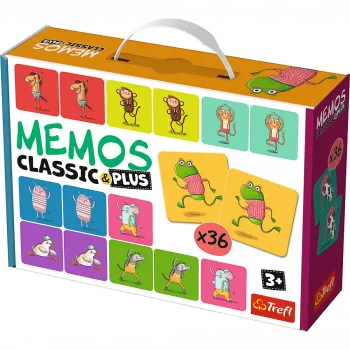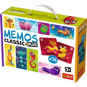 Настільна класична сімейна гра на розвиток пам'яті від польської компанії Trefl.  Як грати в Мемос? Всі картки необхідно у випадковому порядку розкласти на поверхні обличчям донизу. Далі гравці по черзі у свій хід відкривають дві будь-які картки, і якщо вони співпали то забирають їх собі і продовжую..
