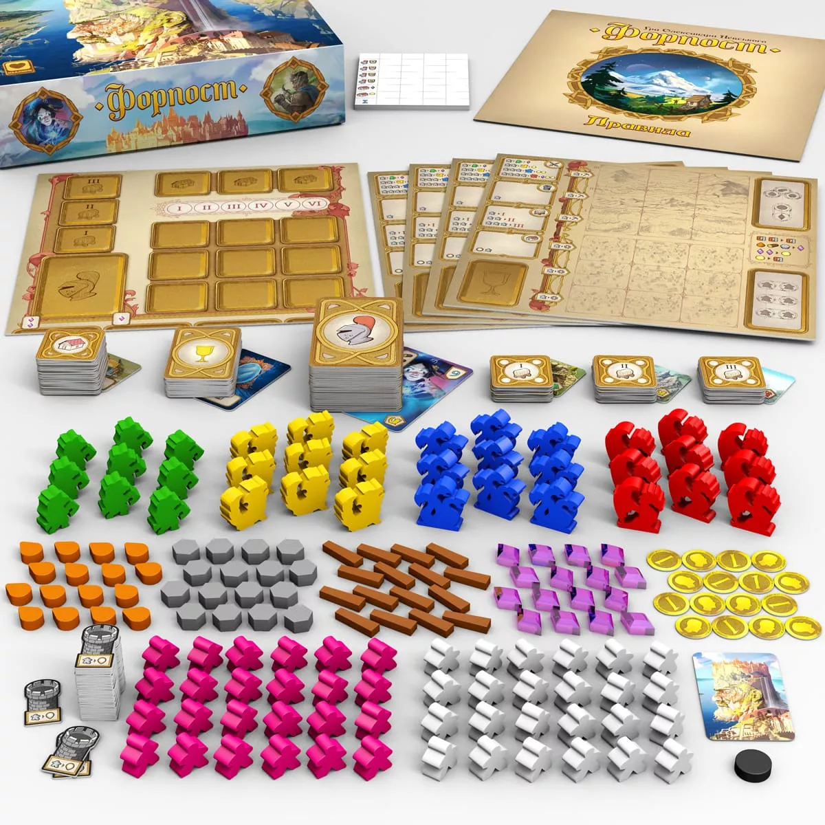У коробці 1 ігрове поле, 4 планшети гравців, 48 карт героїв, 14 жетонів артефактів, 36 плиток будівель (по 3 кожного типу), 24 фігурки базових поселенців, 24 фігурки додаткових поселенців, 36 фігурок монстрів (по 9 кожного з чотирьох кольорів), 36 жетонів фортифікацій, 36 плиток територій, 48 фішок звичайних ресурсів, 32 фішки рідкісних ресурсів, 1 маркер раундів, 1 жетон першого гравця, 1 блокнот для підрахунку очок, правила