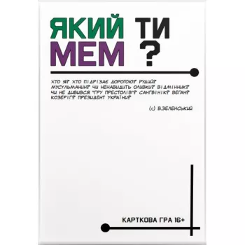Пориньте у світ дотепного українського гумору та неперевершених інтернет-мемів з настільною грою "Який ти МЕМ? Патріотична колекція"! Це не просто гра, це справжнє свято сміху, що об'єднує друзів та родину навколо актуальних українських подій, культурних особливостей та неперевершених висловів, які ..
