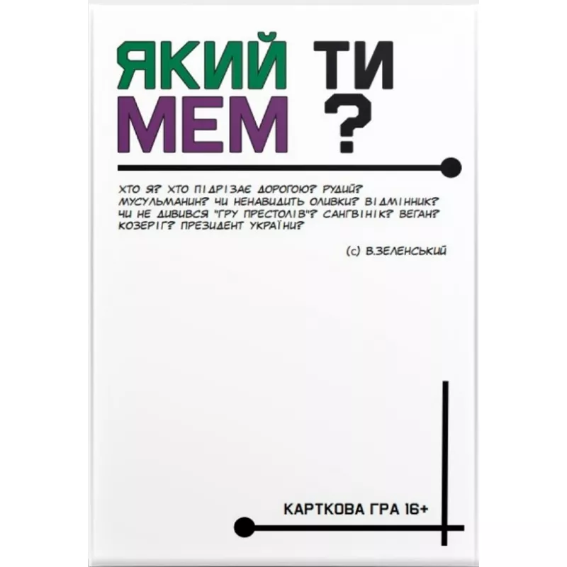 «Який ти МЕМ?» – це візуальна скарбниця інтернет-гумору останніх років, що пропонує гравцям кумедно та вигадливо поєднувати зображення із підписами. Переможе той, хто обере найвлучніший варіант!Випуск «Який ти МЕМ? Класична колекція» є самостійною грою, що присвячена найпопулярнішим світовим мемасик..