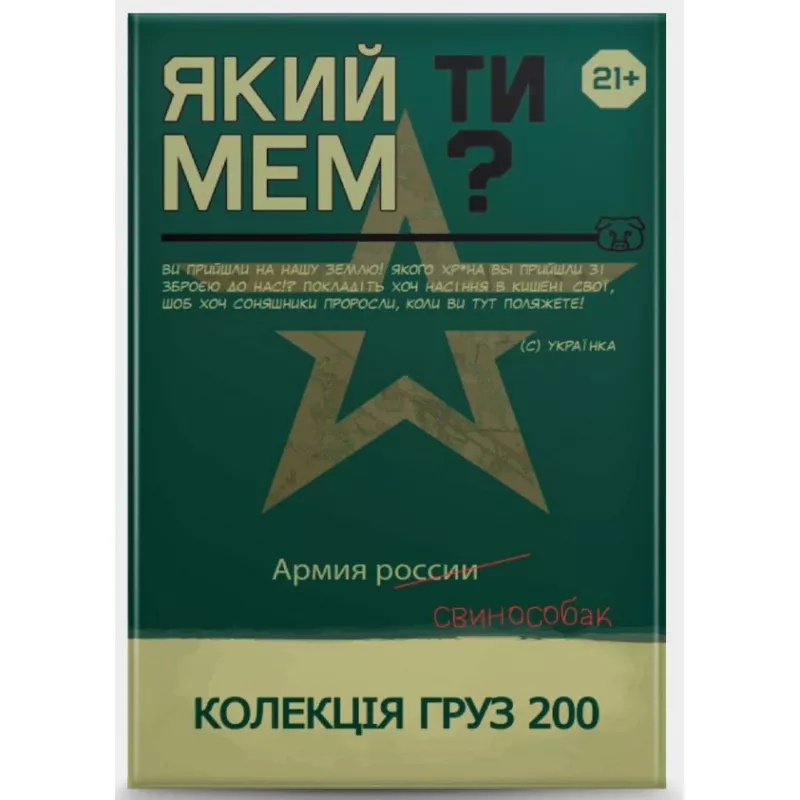 "Який ти МЕМ? Груз 200 колекція" — це настільна гра, яка об’єднує шанувальників інтернет-гумору. Гравці повинні влучно поєднувати зображення мемів із підписами, щоб створити найсмішнішу комбінацію. Перемогу здобуде той, чий мем виявиться найбільш влучним і кумедним. Вміст коробки: 32..