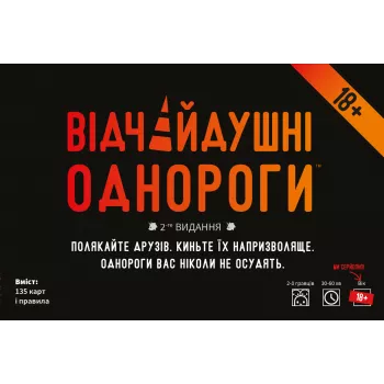 Для дорослих однорогів«Відчайдушні однороги 18+» — це особливий випуск популярної гри для компанії «Відчайдушні однороги», призначений виключно для повнолітніх гравців. Дорослий гумор, непристойності та сексуальні референси — ваша однорогова вечірка набирає небезпечних обертів. А для найрозкутіших і..