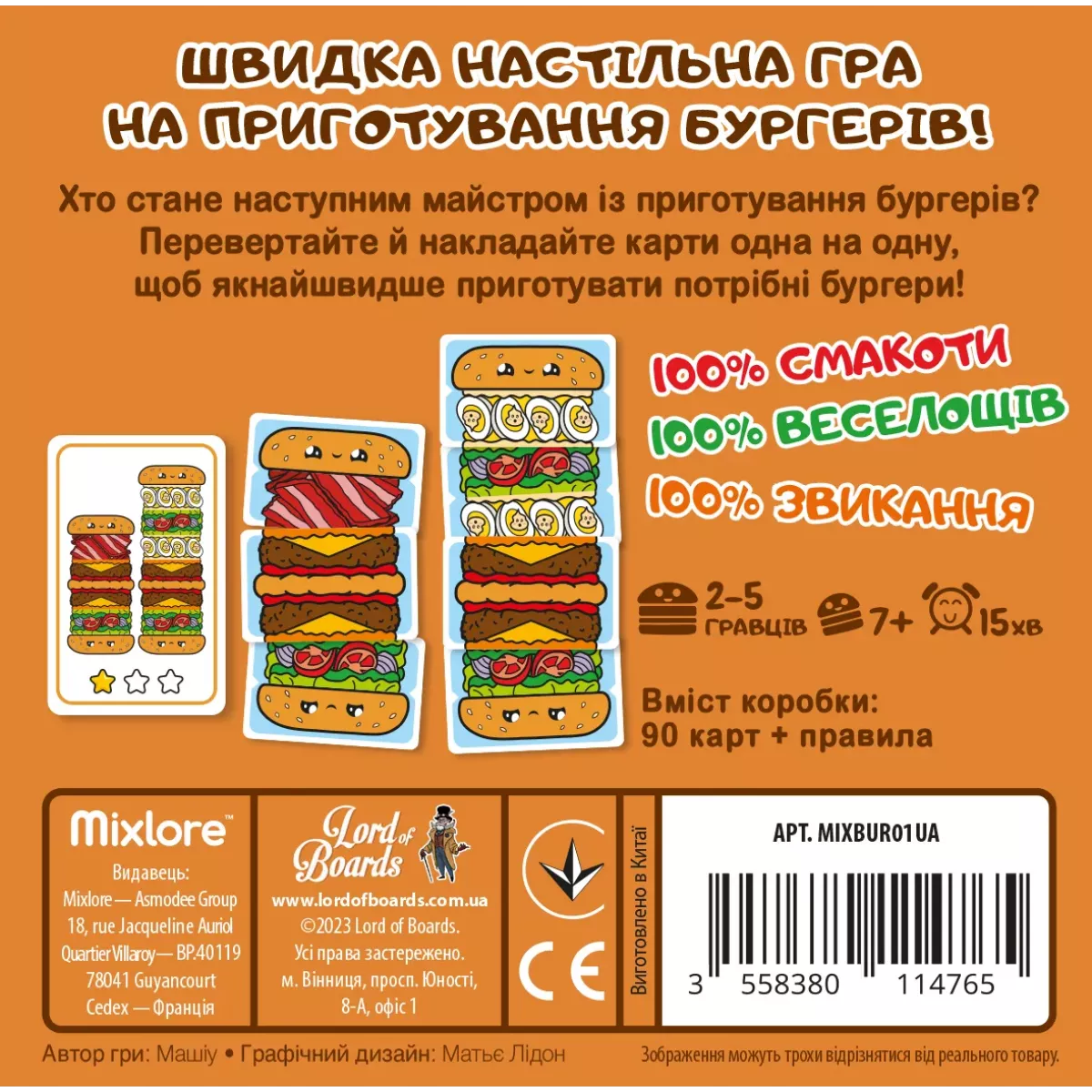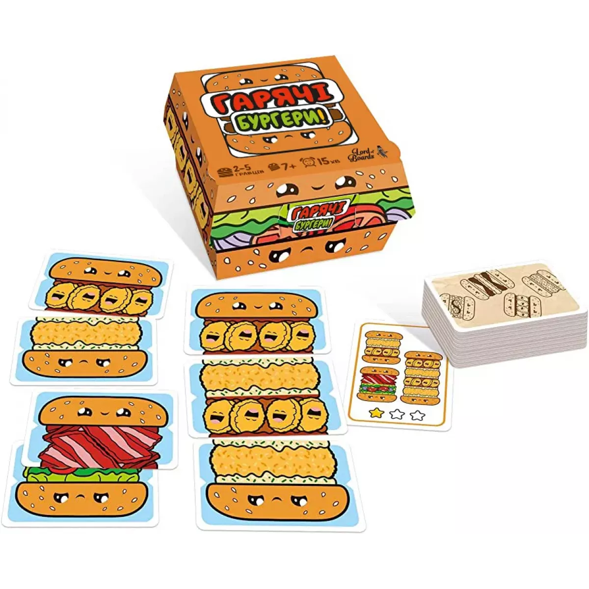 Ой, що це, що це? Пухкенька булочка, соковита котлетка, свіжесенький салатик та тягууучий сир! Смакові рецептори вас не обманюють, це гаряченька бургерно-будівна гра Гарячі Бургери! Гра створена для розпалювання апетиту від 2 до 5 гравців будь-якого віку, яким потрібно буквально 15 хвилинок, аби зібрати свої власні величезні, гарячущі та соковиті бургери! У чому смак гри? Кожен з гравців отримує набір інгредієнтів і, як тільки відкривається нова картка із замовленням, намагається якомога швидше і правильніше зібрати бургер (або декілька бургерів, оце апетит!), вказаний на цій картці. Хто впорався першим - кричить «БУРГЕР!» і забирає картку замовлення собі. Гей, не так швидко! Забирає замовлення собі, тільки якщо він абсолютно правильно виконав замовлення! Якщо ж він допустив помилку - інші кухарі все ще можуть приготувати гостю правильне замовлення! Хто ж кращий шеф? А той, хто перший назбирає виконаних замовлень на 5 зірочок. Або ж, якщо всі гравці вже досвідчені, і солоними огірками їх не налякати, у грі передбачено ускладнений режим зі ще більшими замовленнями! І вимоги до кількості переможних очок теж виростуть. То що, ви готові? Ваші оченята вже блищать, а апетит розігрався? Тоді хапайте гру Гарячі Бургери та починайте разом із друзями заробляти свої перші зірки Мішлен! Увага! Протектори в комплекті до гри не йдуть, але вкрай необхідні, аби від виду соковитих інгрідієнтів на картки не капала слинка! Якщо ж вам більше до смаку їжа східної кухні, зверніть увагу на гру Рамен! Рамен!, у якій ви зможете приготувати найсмачнішу локшину!