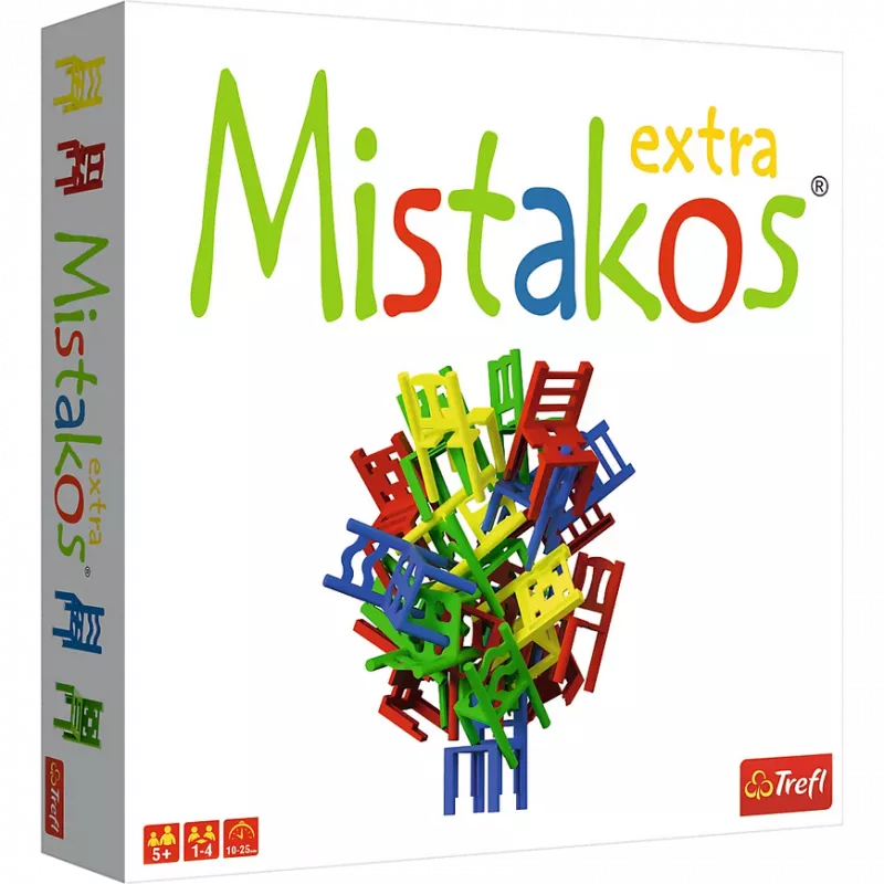 Настільна гра «Міstakos EXTRA» - розширена версія «Cтільчиків», що містить 8 додаткових жовтих стільчиків. Тепер ви зможете побудувати ще більшу вежу з різнокольорових стільців! НАСТІЛЬНІ «СТІЛЬЧИКИ»Цікава гра на спрітність на зразок «Дженги» або «Звіровежі» з самими справжніми маленькими стільчикам..
