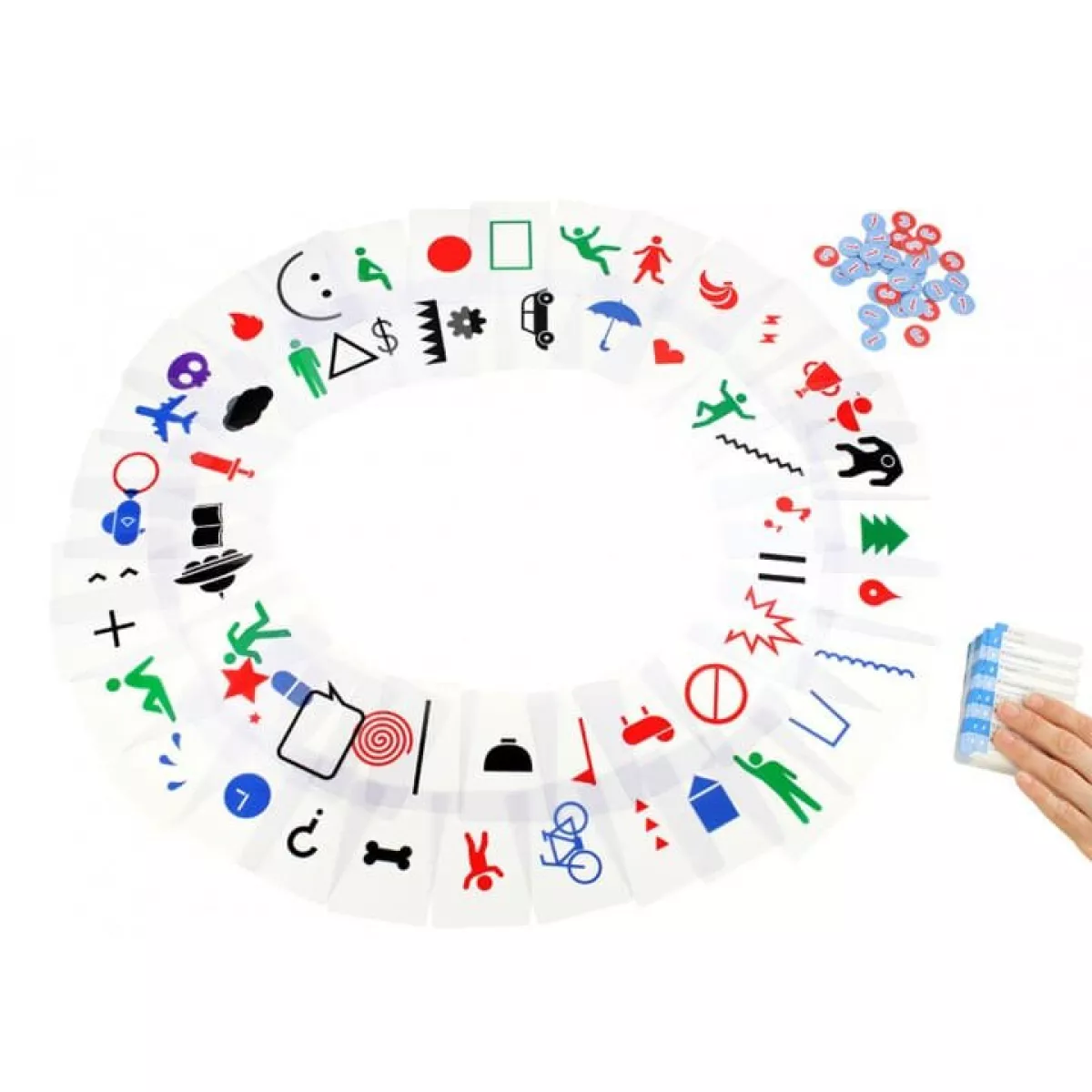 У коробці 60 прозорих карт, 65 карт із завданнями (1040 слів і словосполучень), 35 жетонів, правила гри