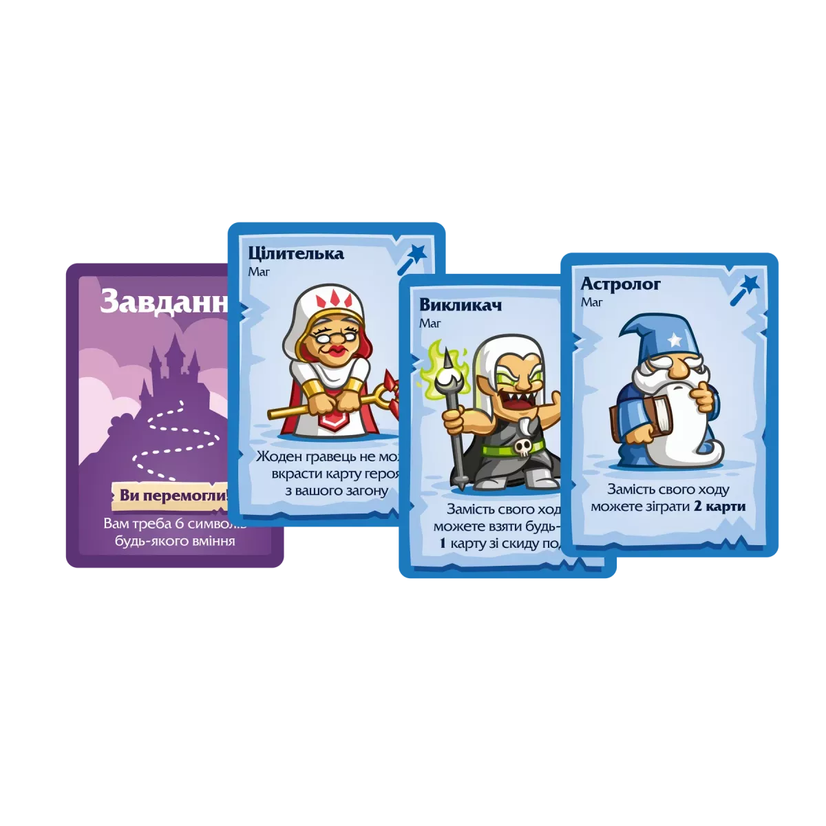 Якщо ви розігруєте карту квесту (фіолетова карта), то ваша команда рятує королівство. Щоб виконати квест, необхідно мати хоча б шість відповідних навичок у своєму загоні героїв. Ці навички вказані на карті квесту, успішний розіграш карти квесту означає перемогу у грі.