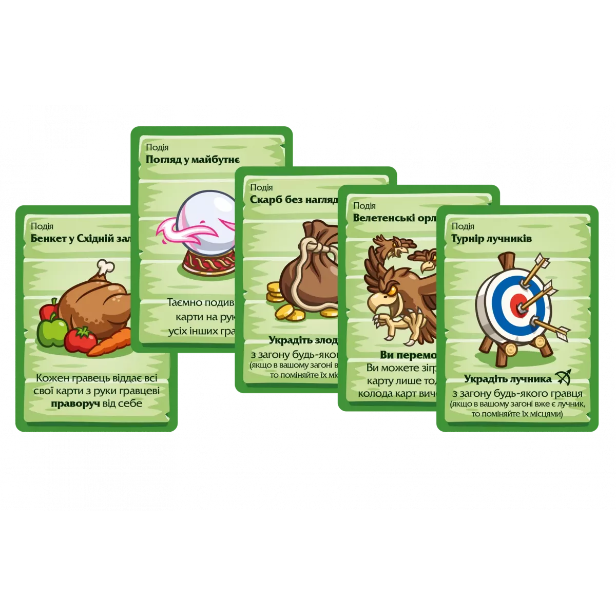 Якщо ви розігруєте карту події (зелена карта), то діє її ефект, а карта скидається. Карти подій дозволять вам викрадати героїв у суперників, підглядати в чужі карти та багато іншого.
