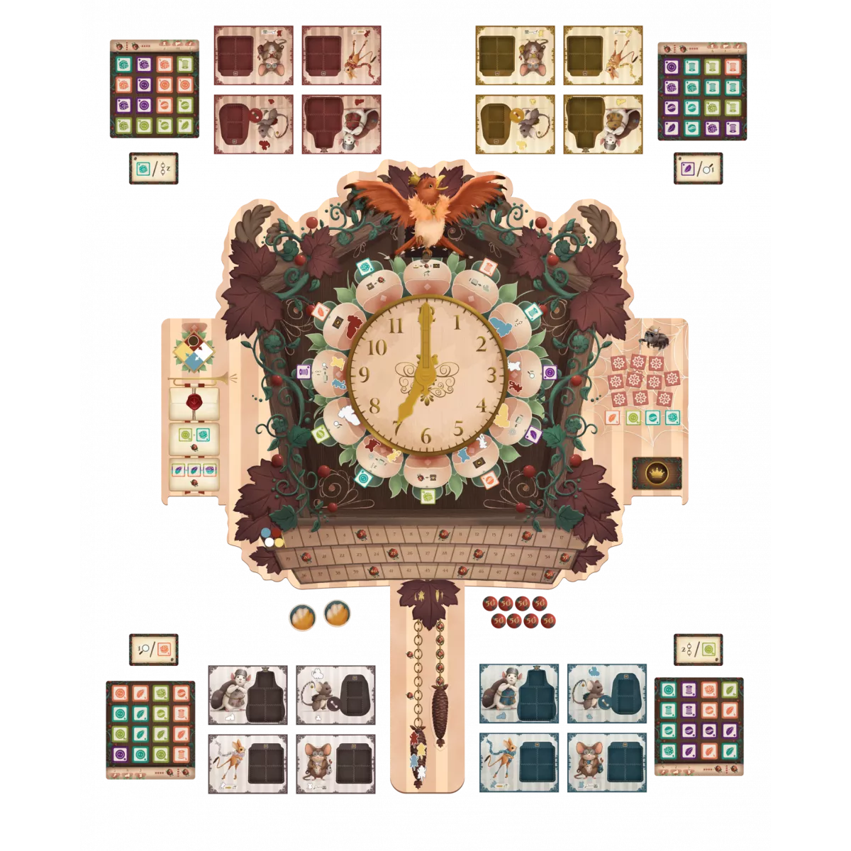 У коробці 1 планшет годинника, 1 механізм стрілок, 2 жетони блокування хвилинної стрілки, 3 частини ігрового поля, 4 планшети пошуку предметів, 1 мішечок, 93 жетони предметів і регалій, 12 жетонів ефектів, 16 карт мишей, 13 карт прихильності, 12 карт завдань , 1 кістка котика, 18 жетонів і маркерів, 2 плиток-пам’яток, правила гри