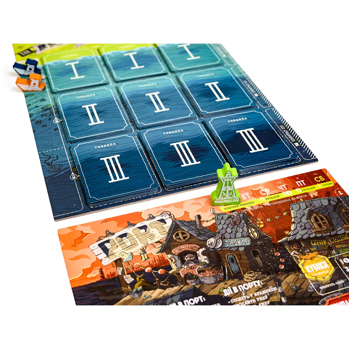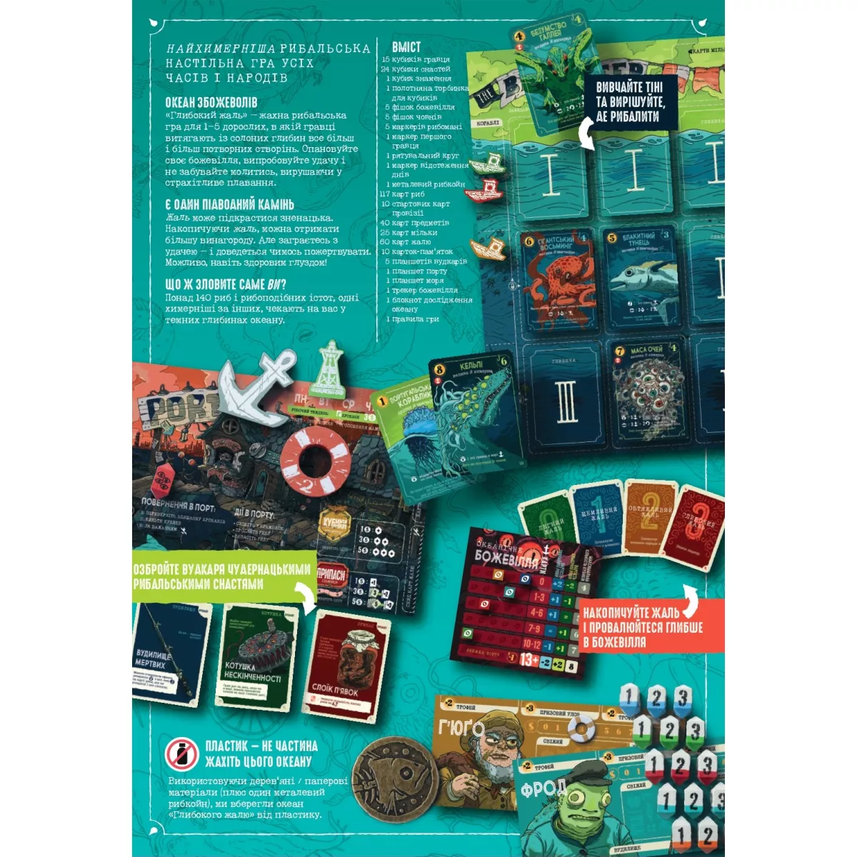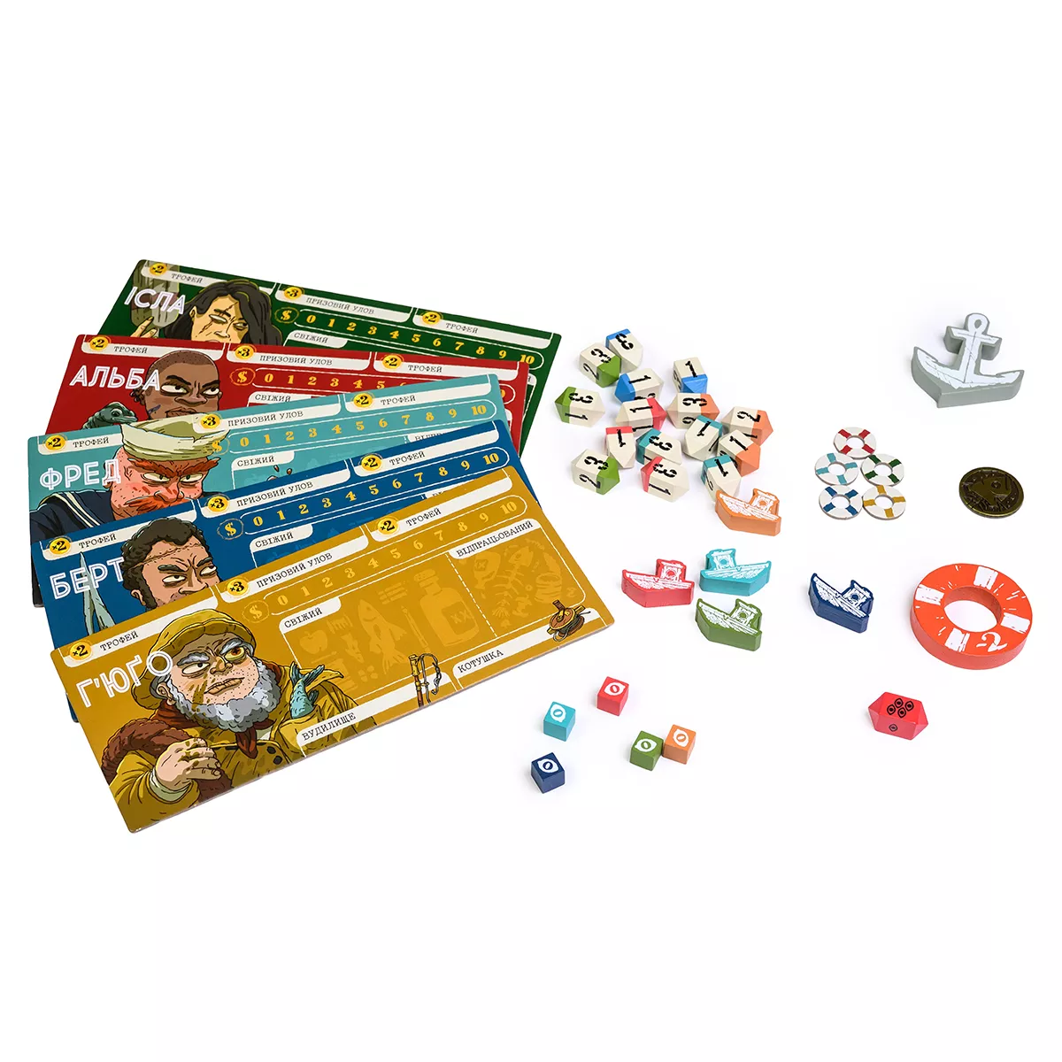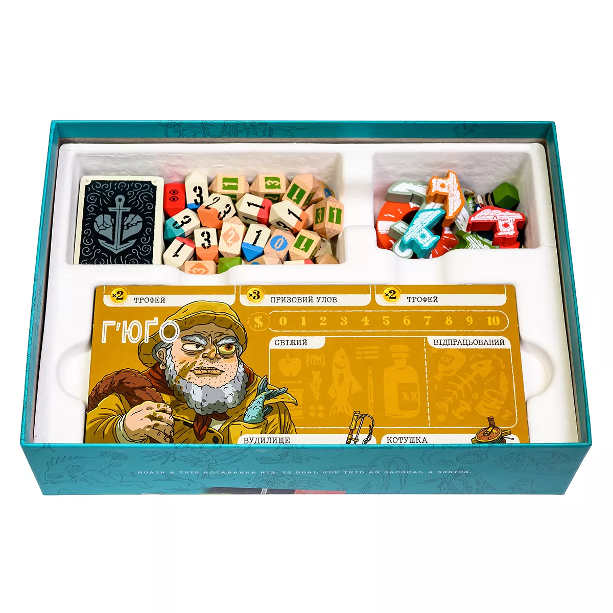 У коробці 1 Кубик знамення, 1 Маркер першого гравця, 1 Рятувальний круг, 1 Рибкоїн, 5 Фішок божевілля, 1 Маркер відстеження днів, 5 Маркерів рибомані, 5 Фішок човнів, 15 Кубиків гравця (по 3 кожного кольору), 24 Кубики снастей, 60 Карт жалю, 25 Карт мільки, 10 Карт вудилищ, 10 Карт котушок, 20 Карт припасів, 10 Стартових карт провізії, 117 Карт риб, 10 Карток-пам’яток, Торбинка для кубиків, Планшет порту, 5 Двосторонніх планшетів вудкарів, Планшет моря, Блокнот дослідження океану, Двосторонній трекер божевілля/Планшет дослідження океану