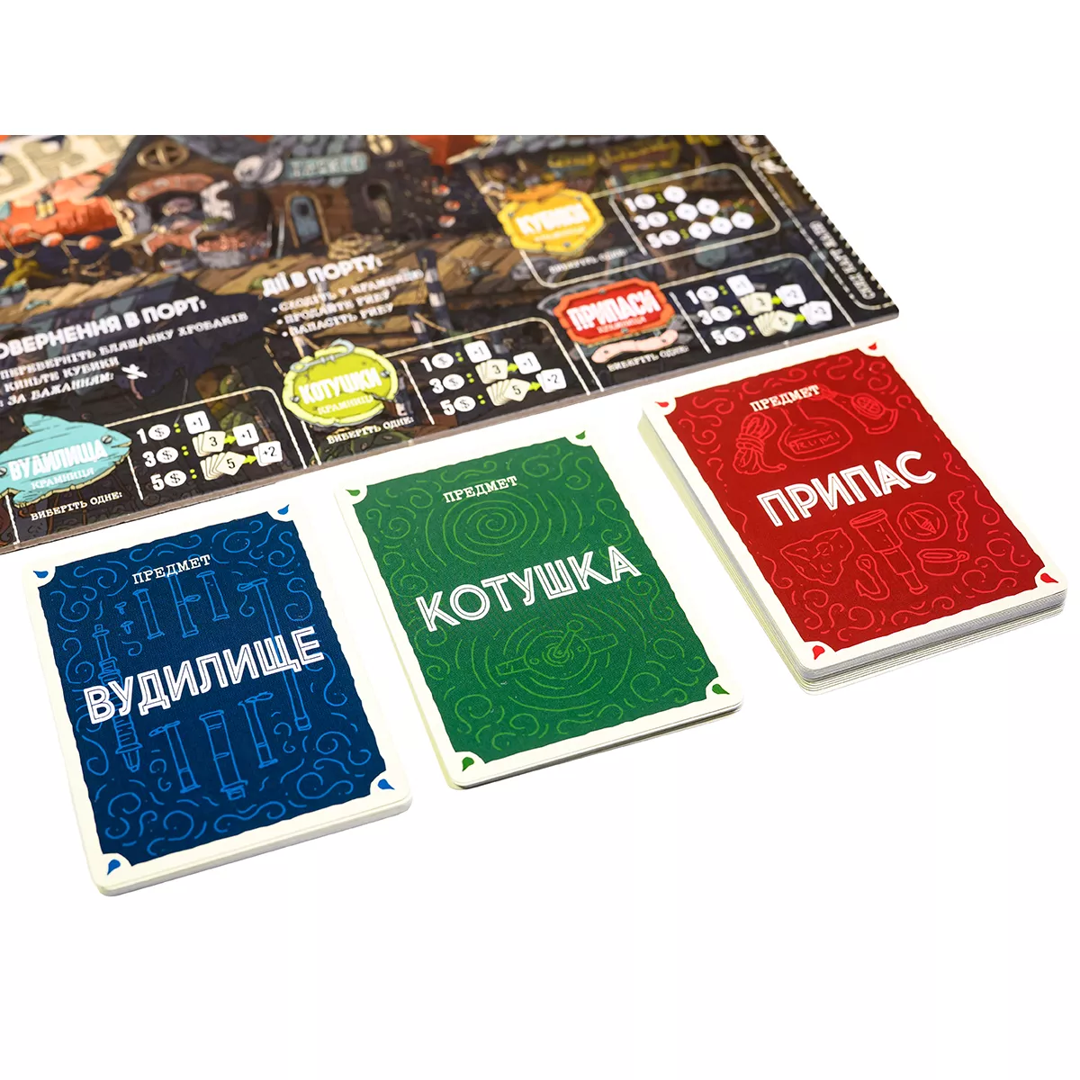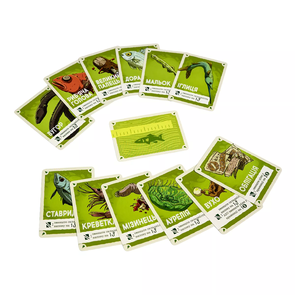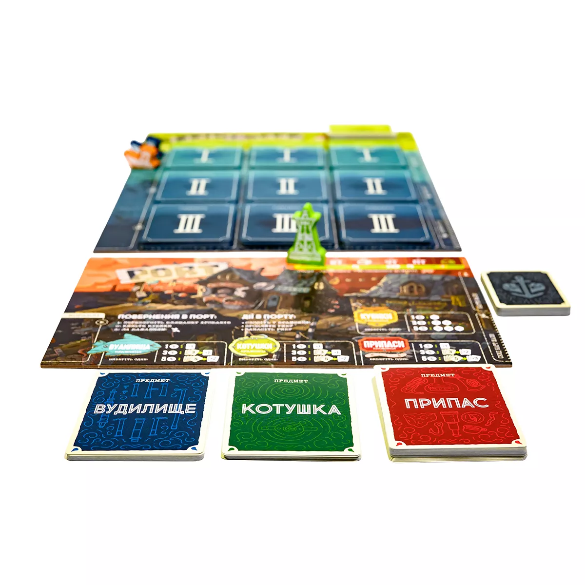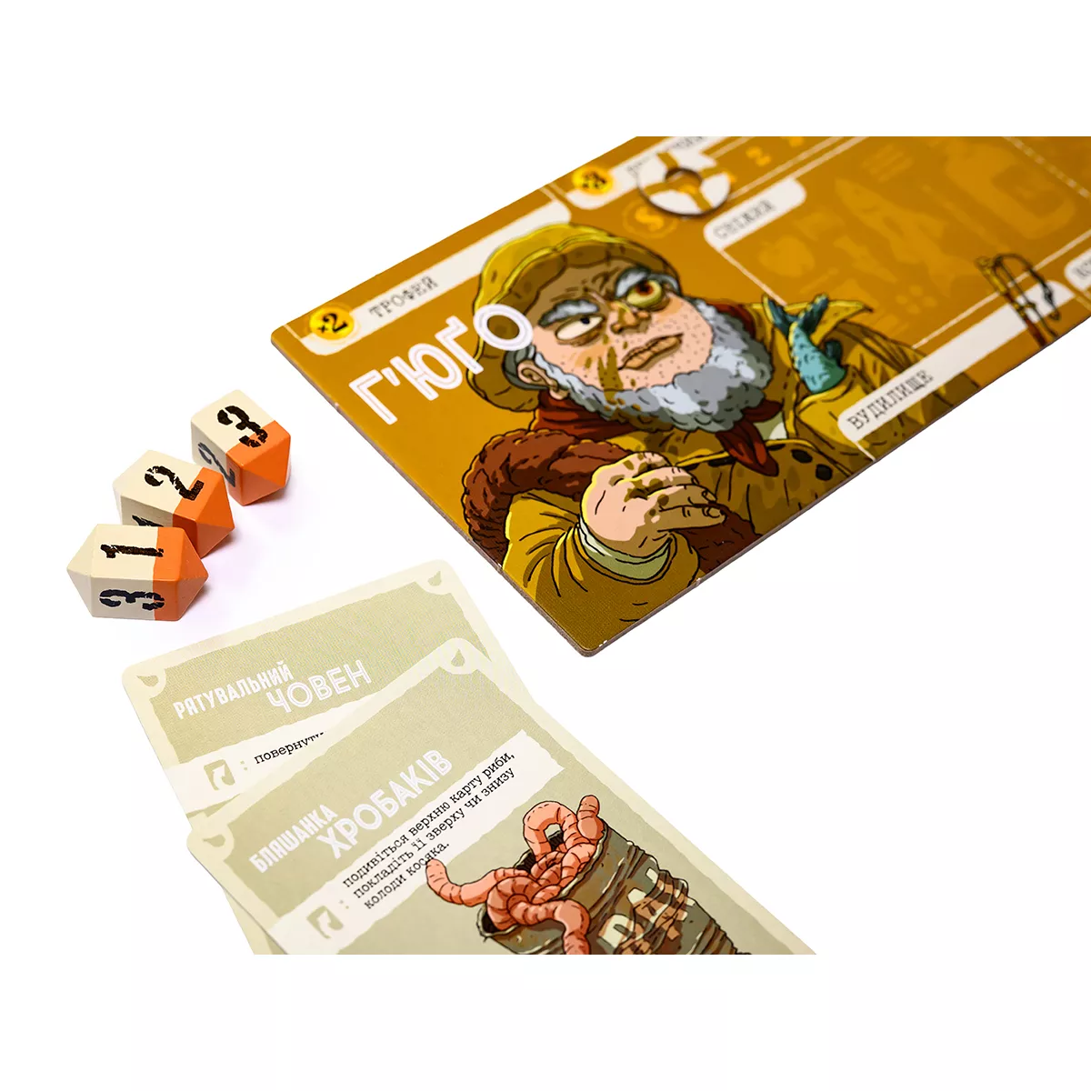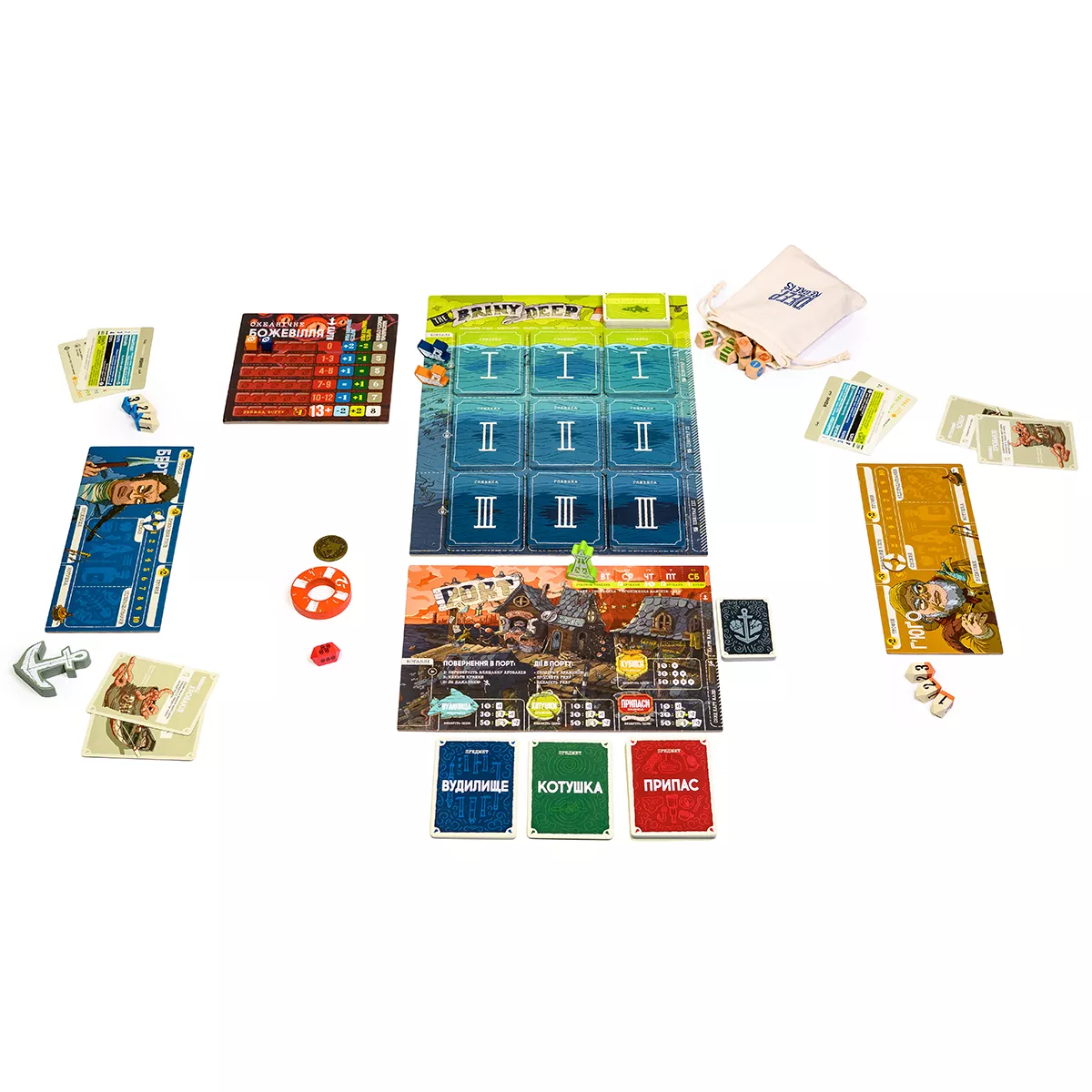 У коробці 1 Кубик знамення, 1 Маркер першого гравця, 1 Рятувальний круг, 1 Рибкоїн, 5 Фішок божевілля, 1 Маркер відстеження днів, 5 Маркерів рибомані, 5 Фішок човнів, 15 Кубиків гравця (по 3 кожного кольору), 24 Кубики снастей, 60 Карт жалю, 25 Карт мільки, 10 Карт вудилищ, 10 Карт котушок, 20 Карт припасів, 10 Стартових карт провізії, 117 Карт риб, 10 Карток-пам’яток, Торбинка для кубиків, Планшет порту, 5 Двосторонніх планшетів вудкарів, Планшет моря, Блокнот дослідження океану, Двосторонній трекер божевілля/Планшет дослідження океану