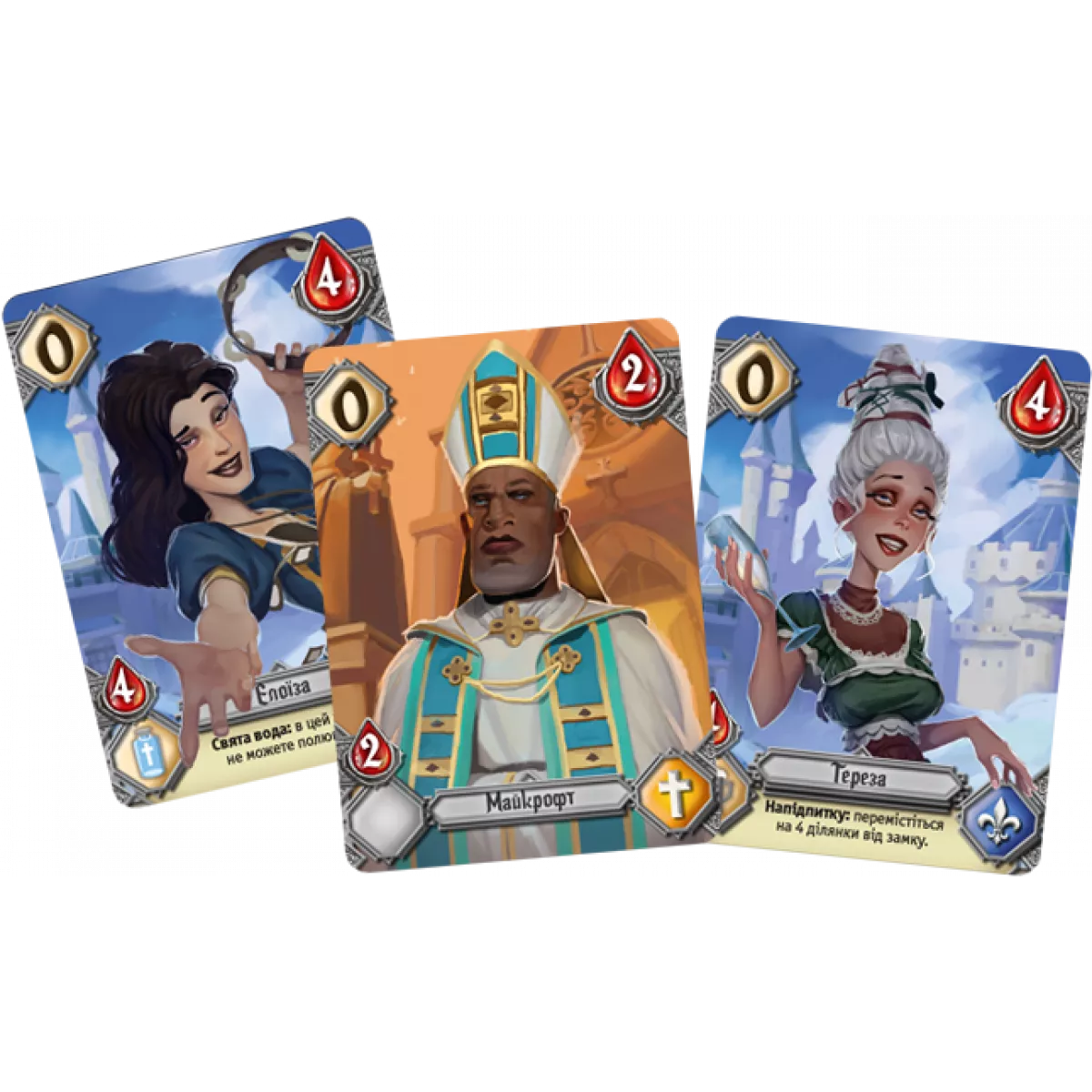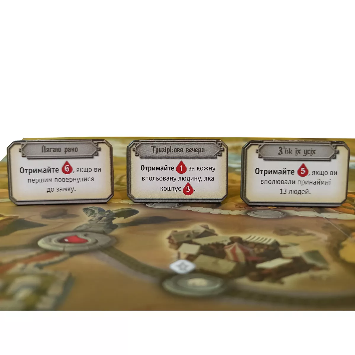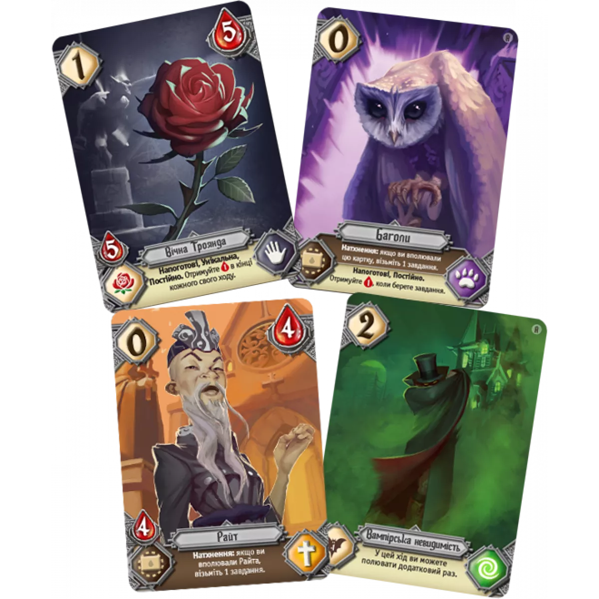 У коробці 122 картки полювання (80 людей, 22 фамільяри, 20 сил), 6 планшетів вампірів, 6 стартових колод по 6 карток, 6 дерев’яних жетонів вампірів, 6 дерев’яних жетонів підрахунку очок, 1 ігрове поле , 3 картки троянд, 1 жетон Місяця , 50 тайлів завдань, 5 жетонів замку , 26 жетонів бонусів, 1 трек полювання