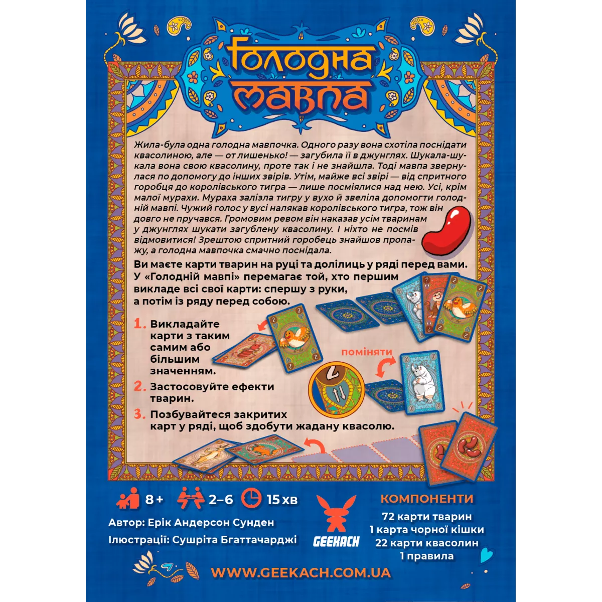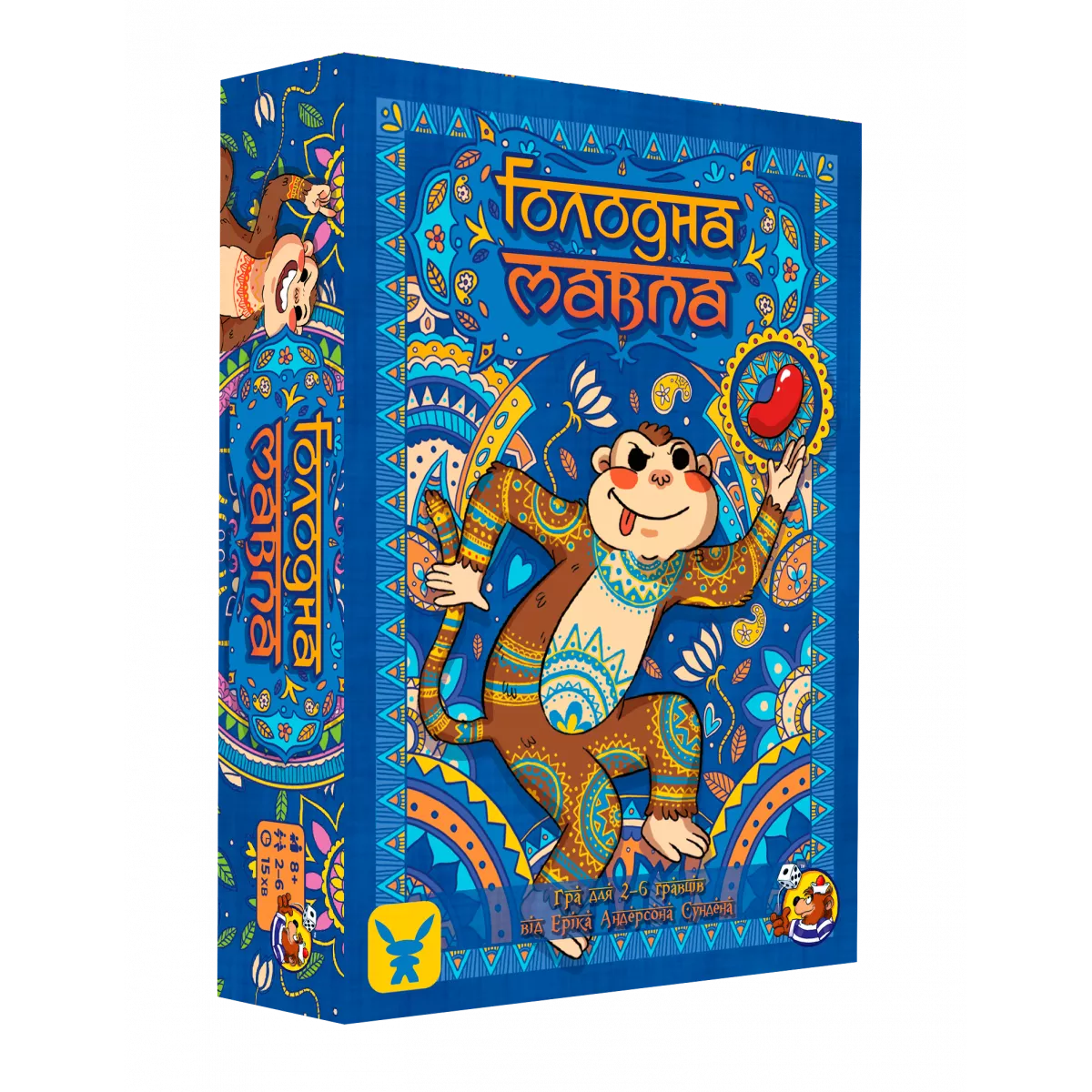 Давним-давно Голодна Мавпа шукала в джунглях свою загублену зернину для сніданку. Вона просила допомоги в інших тварин, від прудкого горобця до королівського тигра, але всі вони ігнорували її благання. Поки Крихітка Мураха не залізла Тигру на вухо і не наказала йому допомогти. Король Тигр злякався голосу у вусі. Він наказав усім тваринам шукати боби, і ніхто не смів відмовити. Зрештою Стрімкий Горобець знайшов зерно, і Голодна Мавпочка нарешті була щаслива. Hungry Monkey — це карткова гра, мета якої — позбутися ваших ручних карт і зібрати боби. У вас є картки з тваринами як в руках, так і в рядку лицьовою стороною вниз. Ви повинні першим зіграти всі свої карти, спочатку з рук, а потім з ряду карт. Ви повинні грати в карти з тим самим чи більшим числом. Ви можете викликати ефект за допомогою могутньої тварини. Якщо ви хочете зіграти в кілька ігор, ви відстежуєте підрахунок очок за допомогою карт Біна. Перемагає гравець, у якого наприкінці останньої гри буде більше бобів.